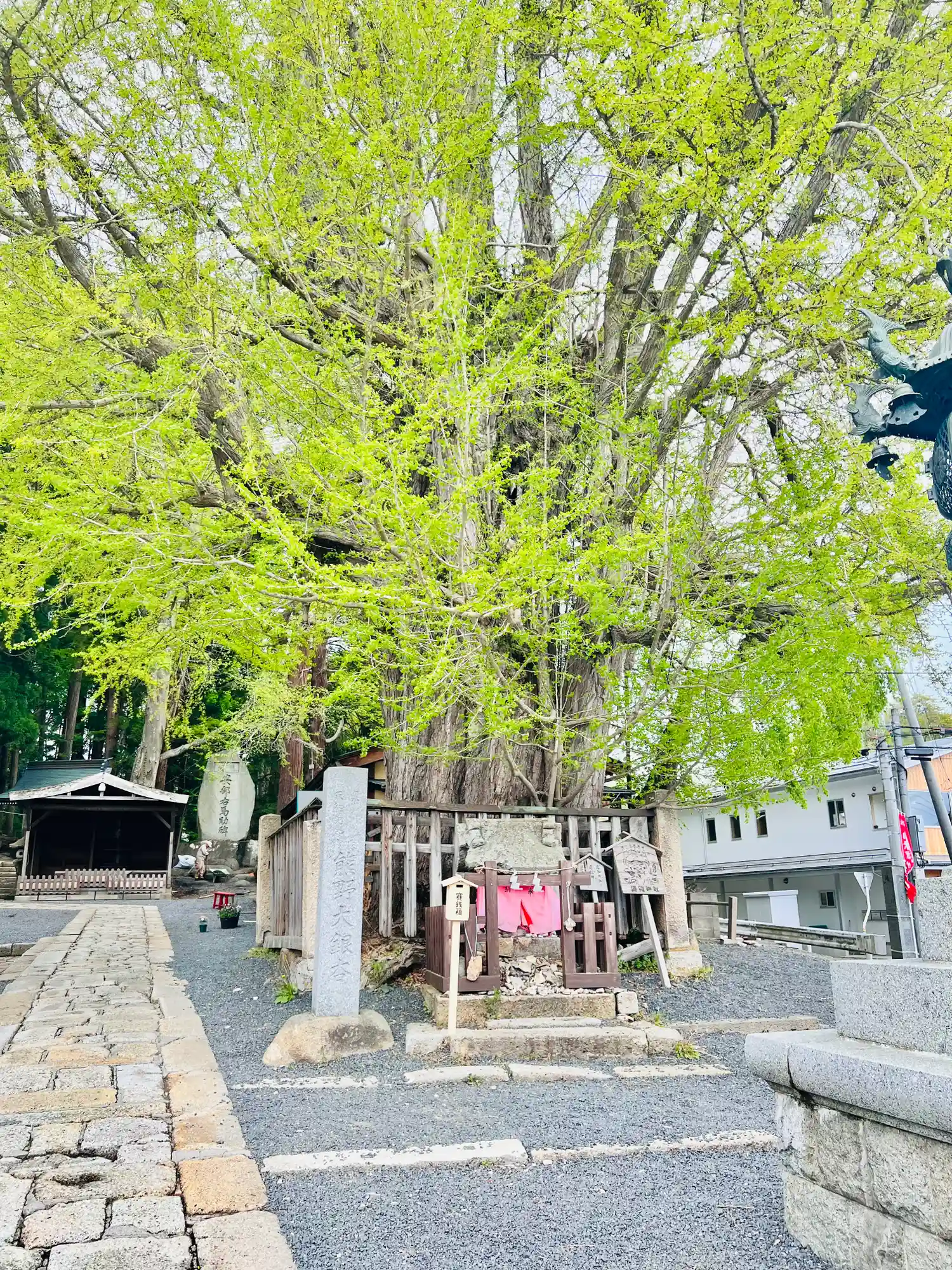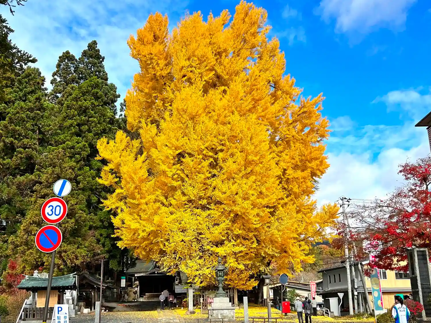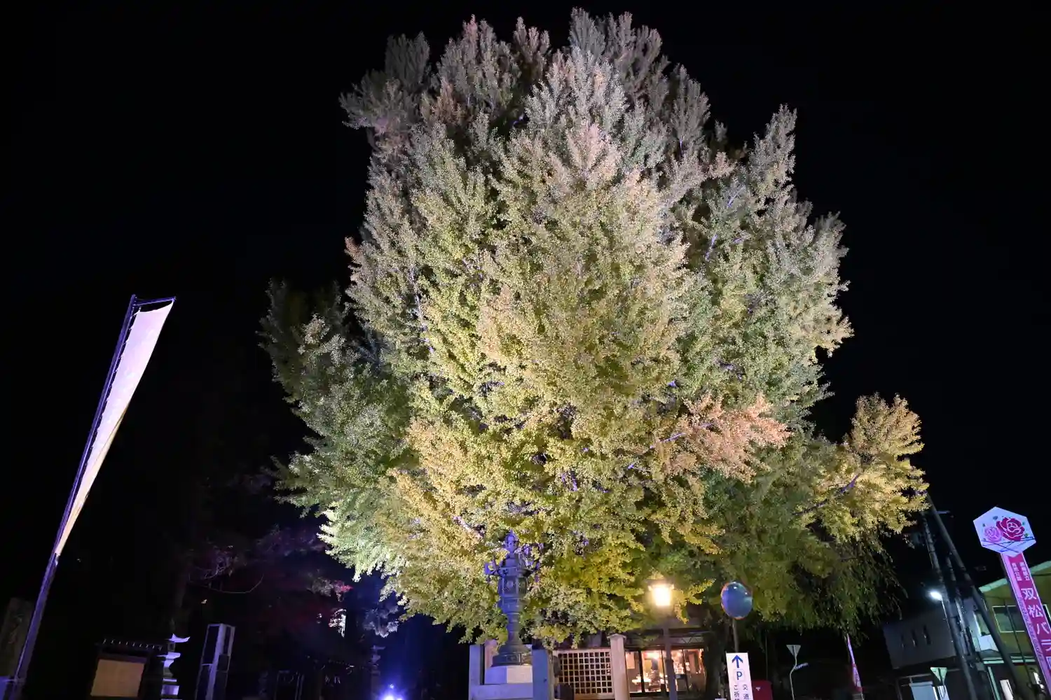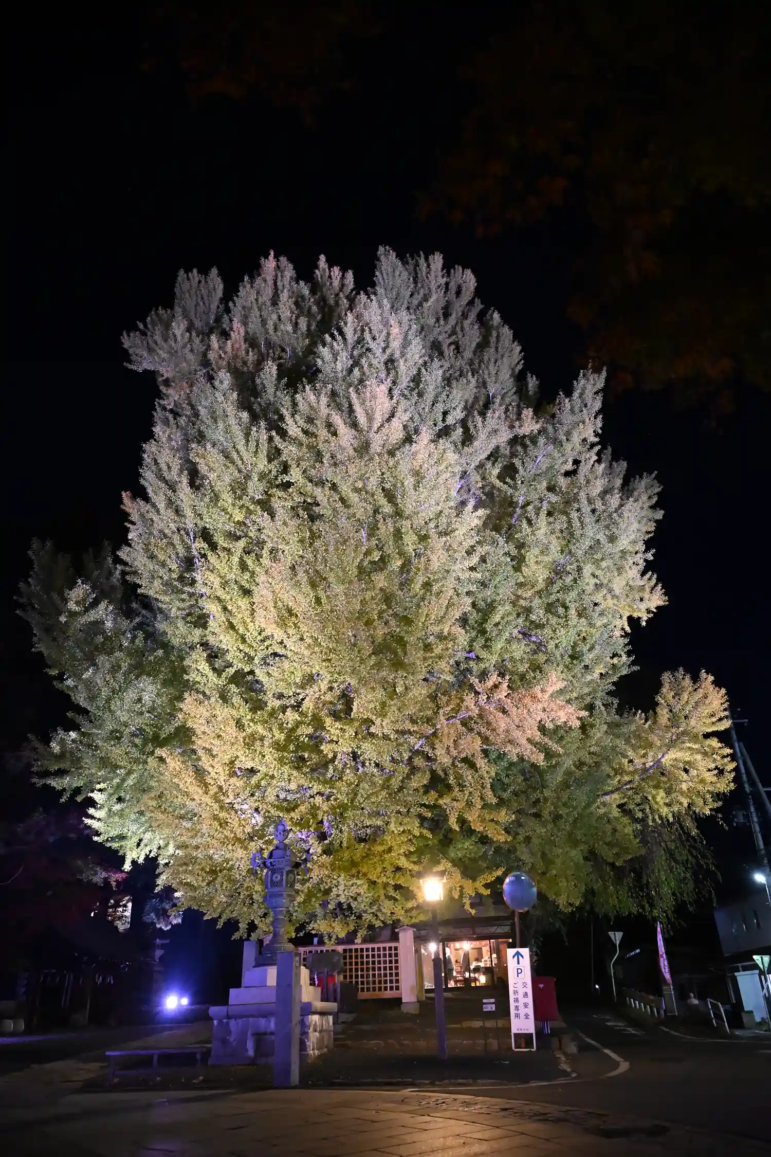 境内南東端入口にある<大銀杏>。推定樹齢は900年。かなり立派で巨大。下を歩く人の背丈と比べると、その大きさがよく分かる。毎年11月だけ、ライトアップがあるみたい。