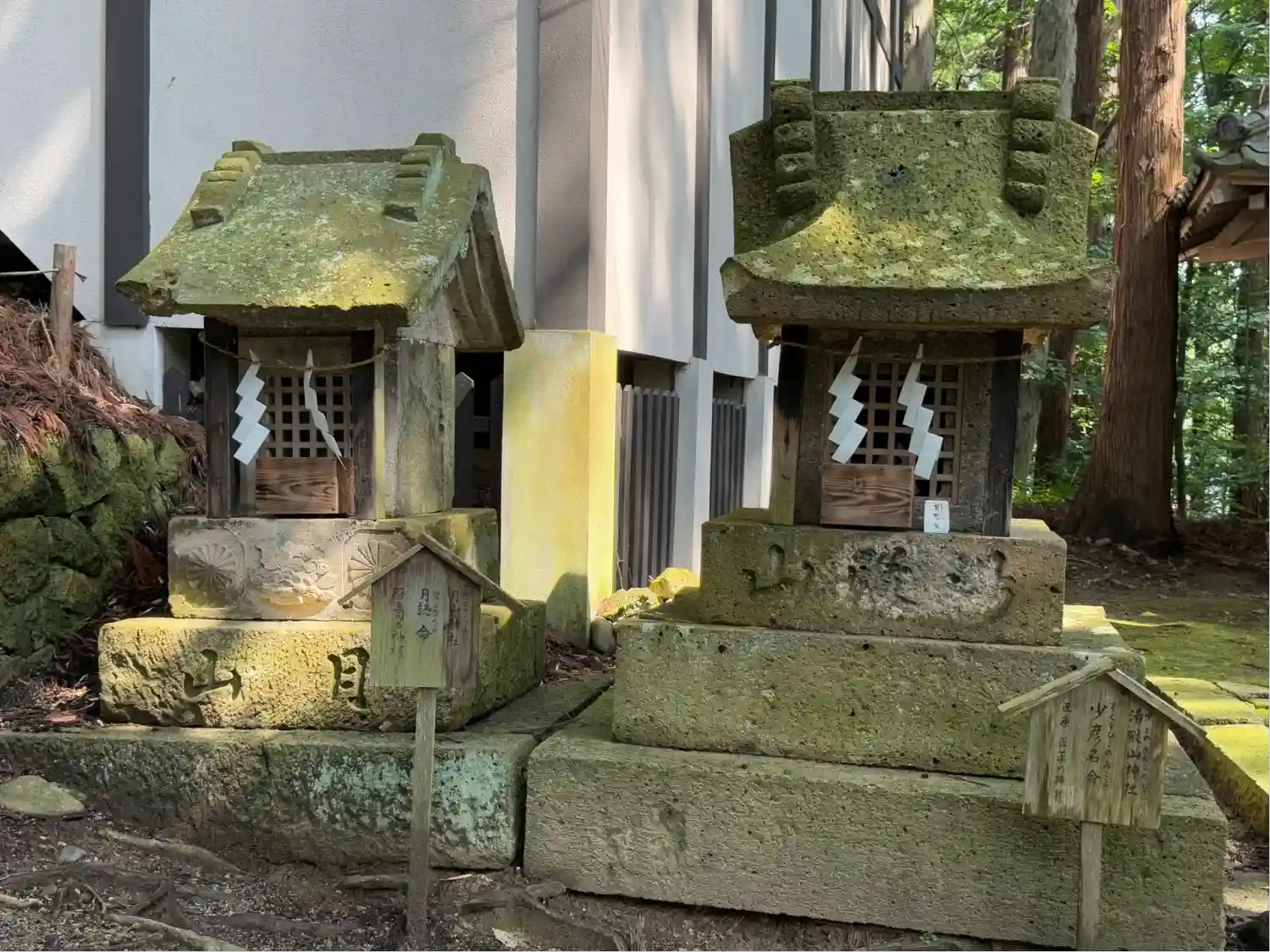 鳥居をくぐってすぐ左側にある石製小祠と石碑。左から順に<雷神社>、<大神宮>、<熊野山供養塔>。