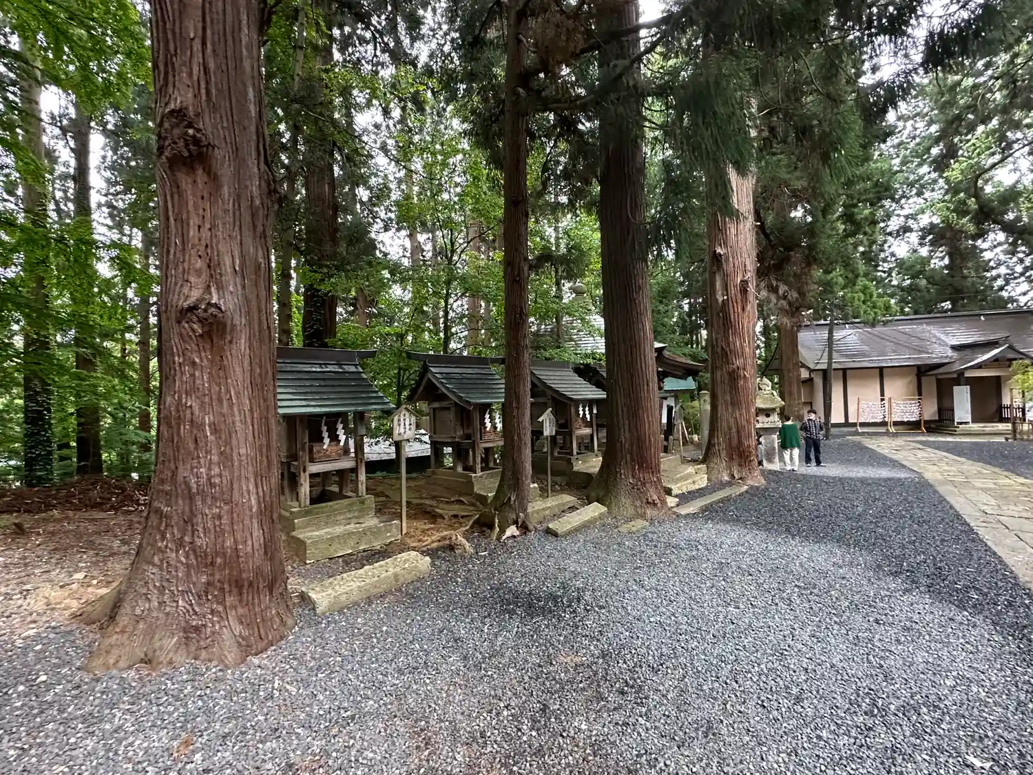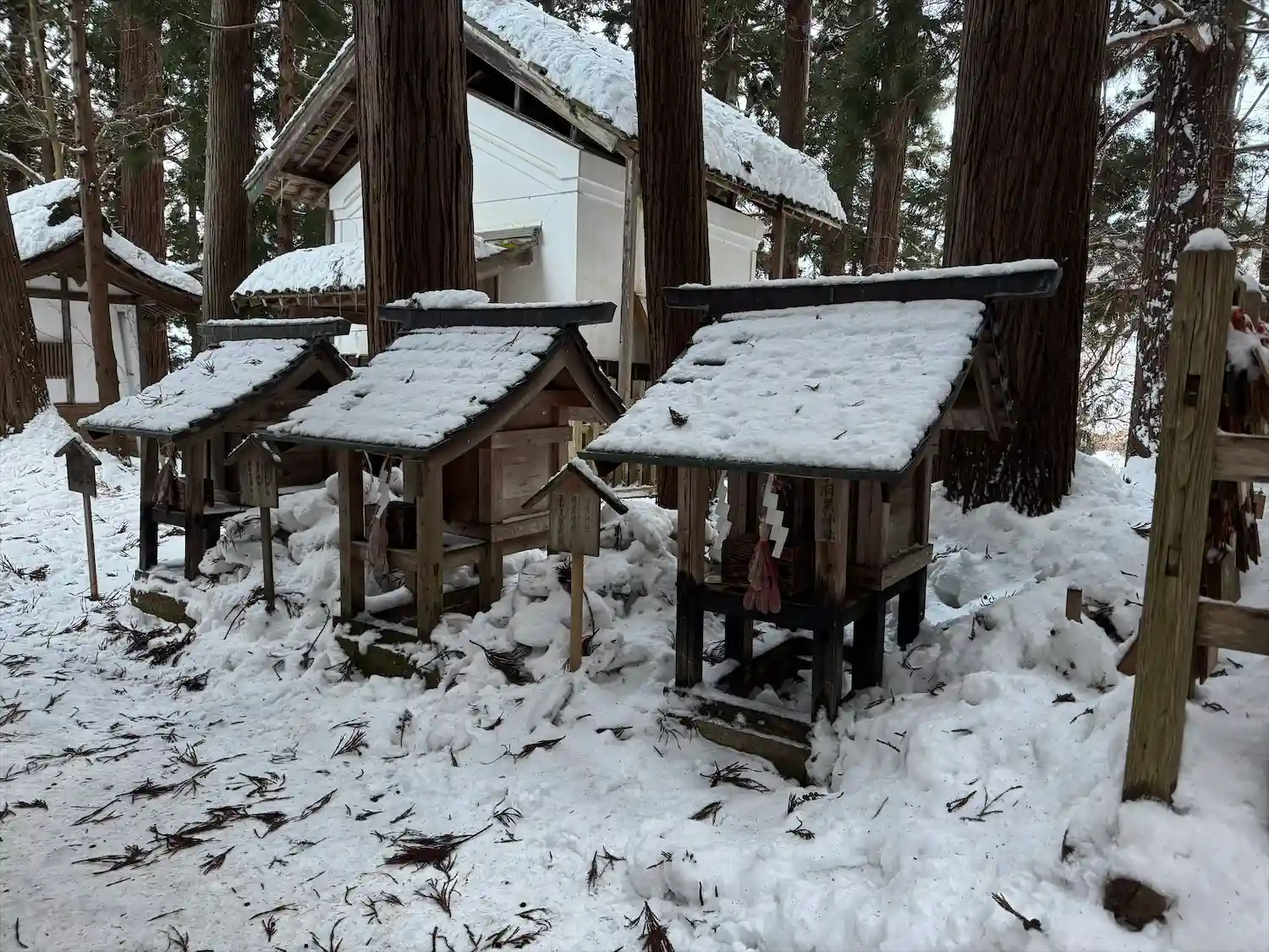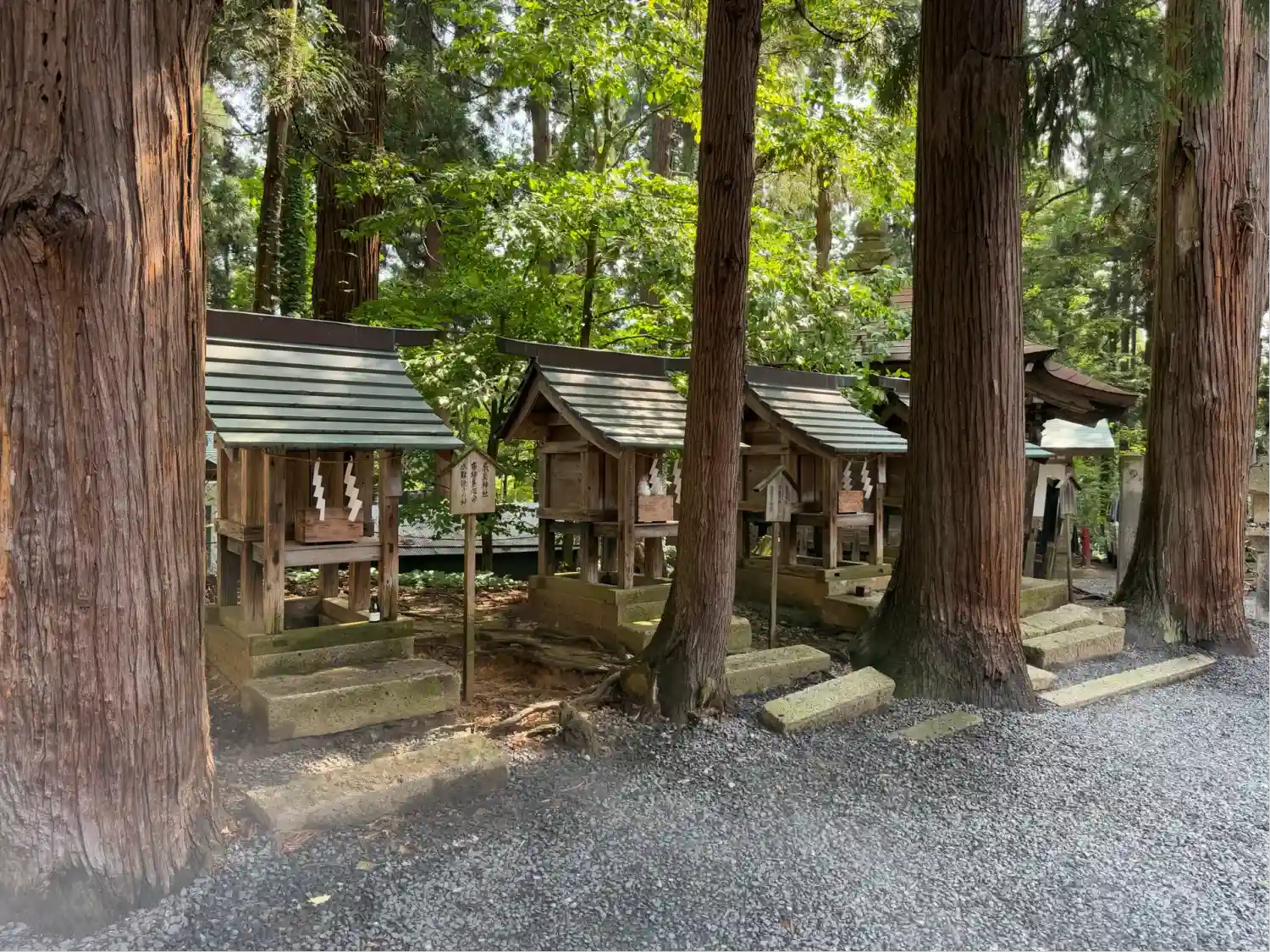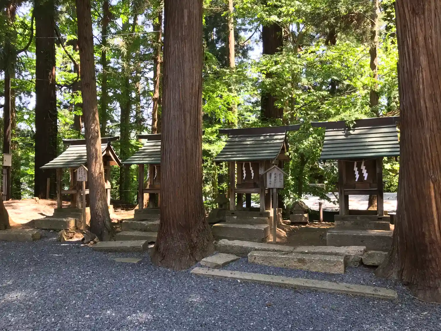 幣殿の右側にある境内社群。左から順に<厳島神社>、<白山神社>、<義家神社>、<景政神社>。