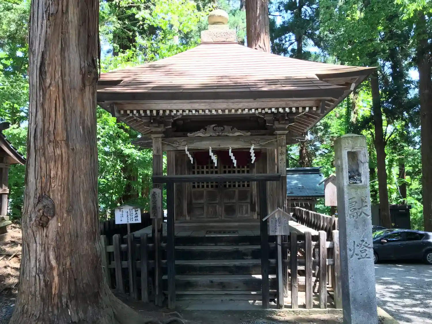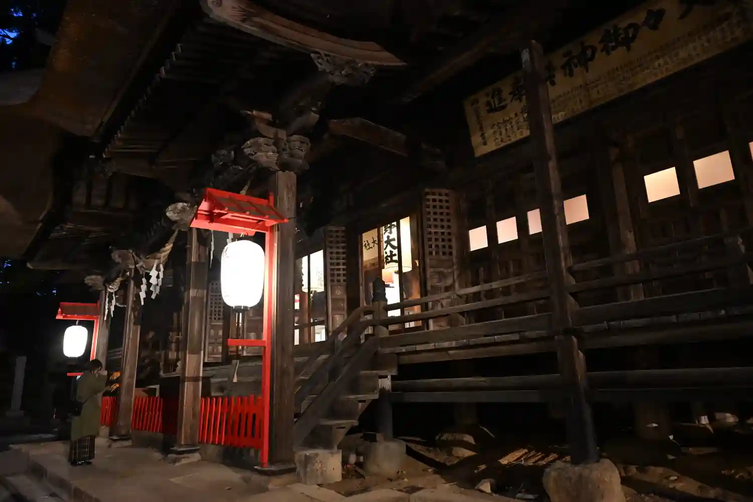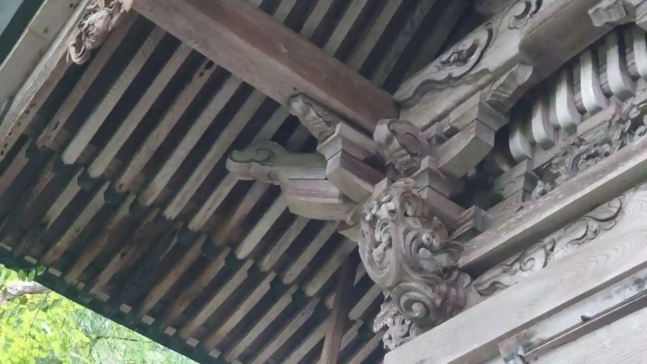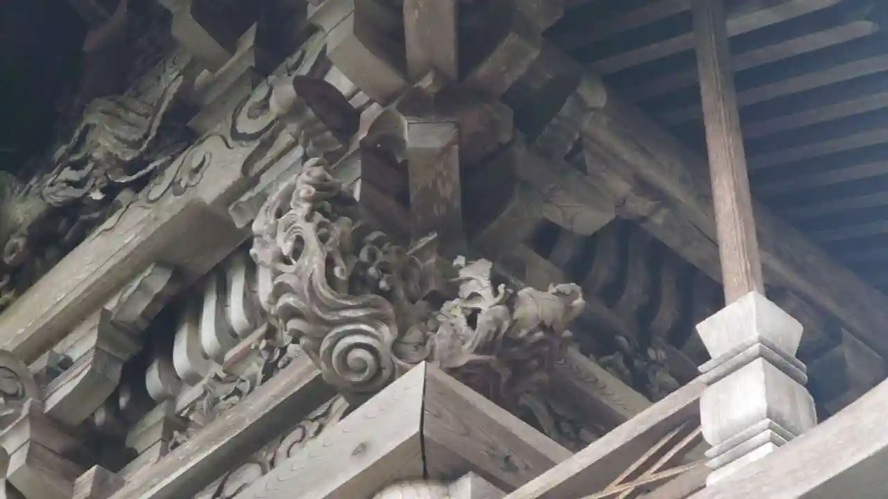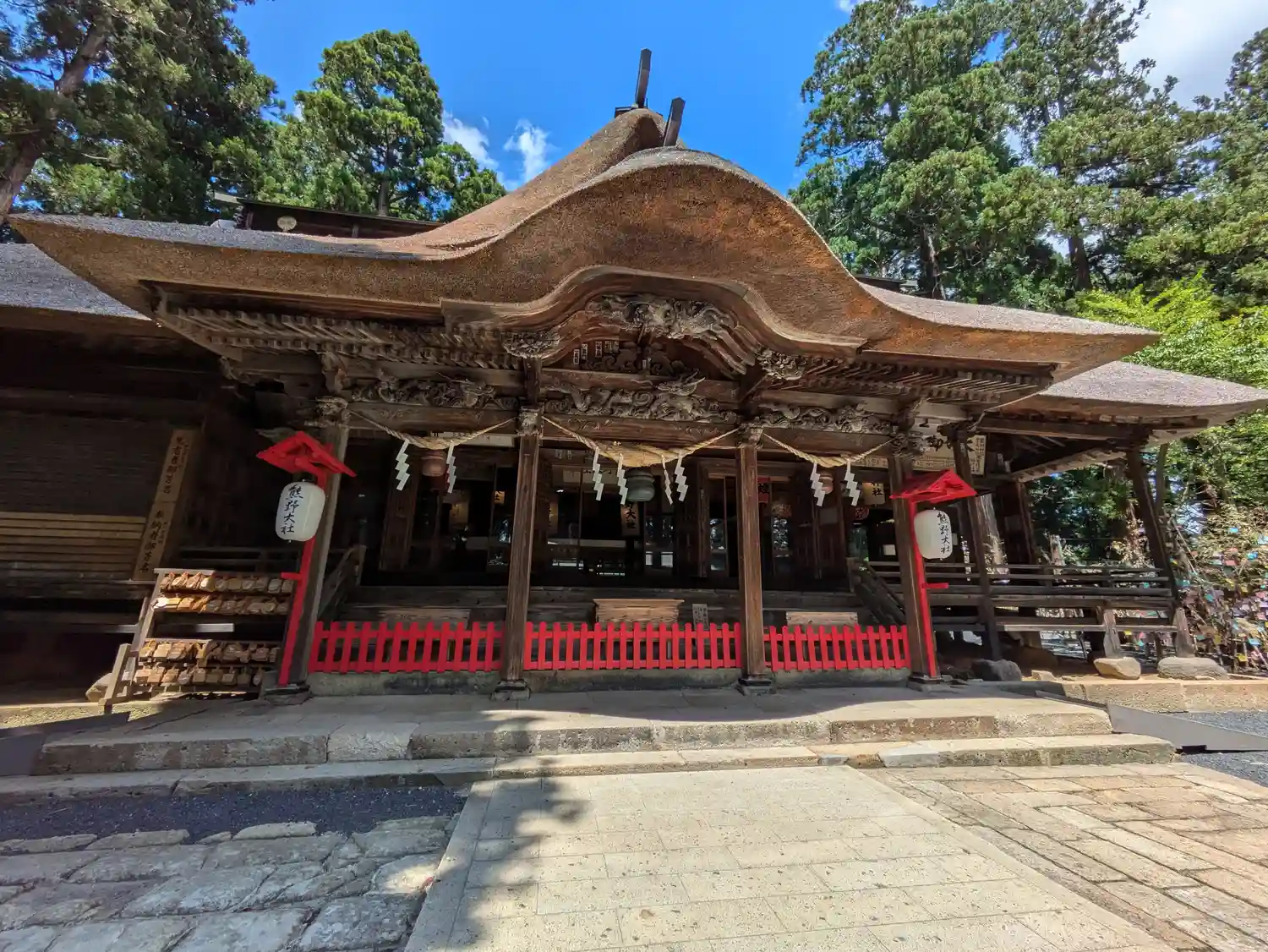 全国でも類似が少ない大規模拝殿。内部には仏間を備え、修験道場としての性格を備えた神仏習合時代の信仰形態をうかがわせる独自の形式。