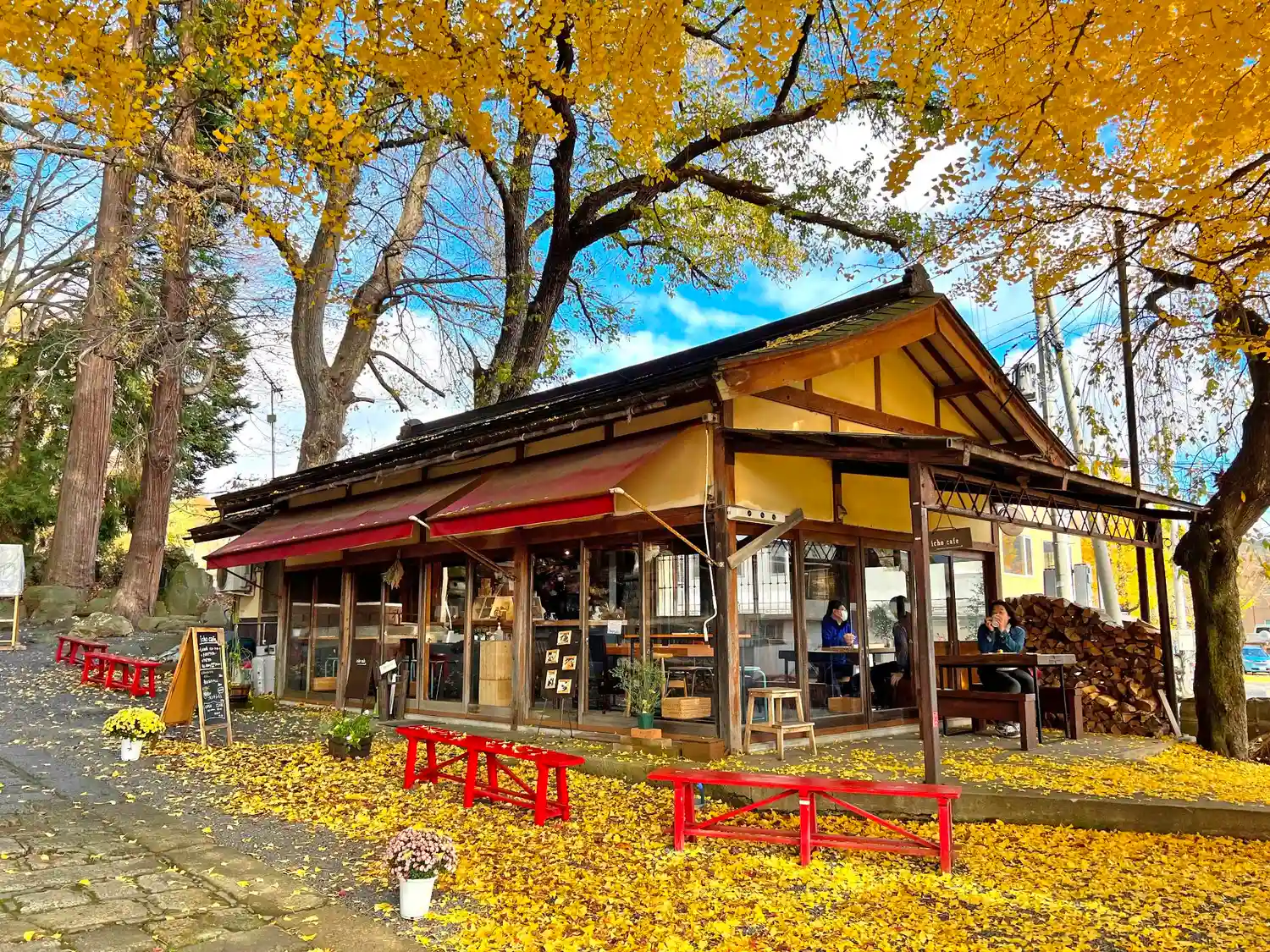 参道右側の茶店、「いちょうカフェ」。天気の良い休日の昼下がりで賑わっている。