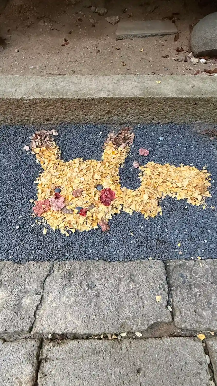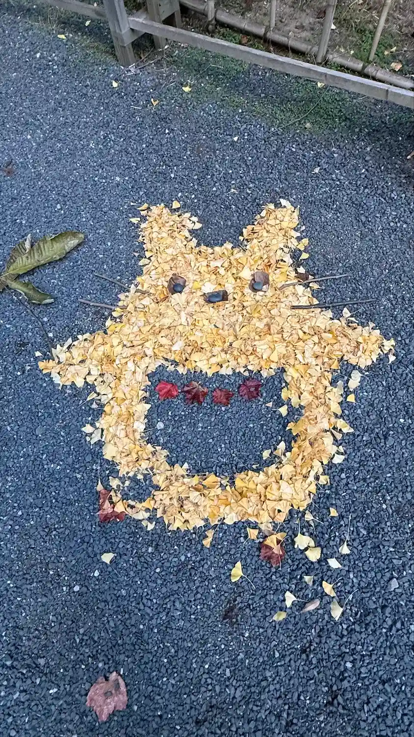 境内の落ち葉🍂🍁で、ミッフィーやミッキー等を描く落ち葉ア…