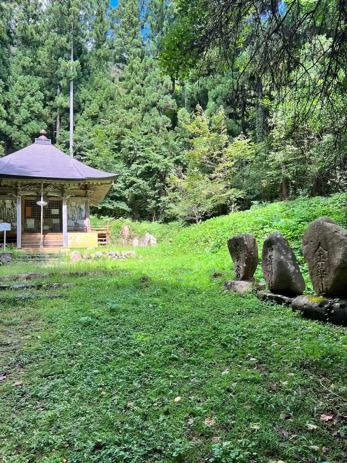 高岡観音堂は宝形造、銅板葺、桁行3間、梁間3間、正面1間向拝付、外壁は真壁造り、素木板張り、正面花頭窓付、向拝木鼻には象と獅子、欄間には龍の彫刻が施されてます。境内には三彭清浄碑(文政2年:1819年の銘、庚申信仰)や南無阿弥陀仏、湯殿山合体碑(鉄門、蓮海の名)、文殊塔、大宮子易碑、廿六夜塔、金華山碑、太神宮碑、古峯神社碑など数多くの石碑、石仏が建立されており信仰の篤さが感じられます。