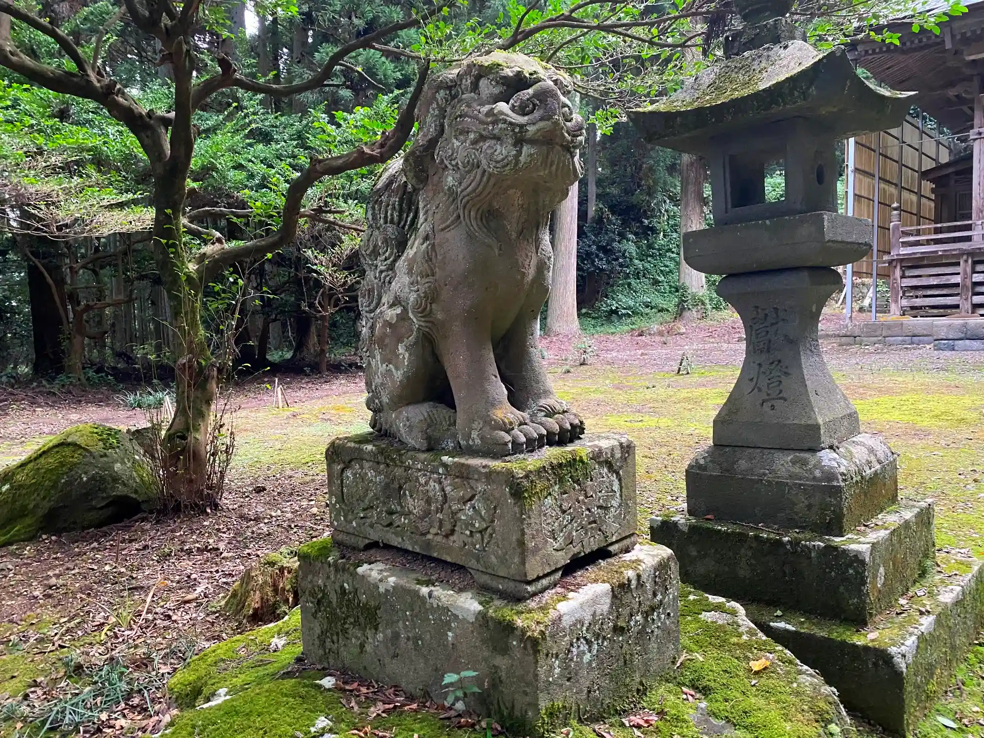 右側の<狛犬>。他の庄内地方の神社と同様、狛犬の台座が高い。