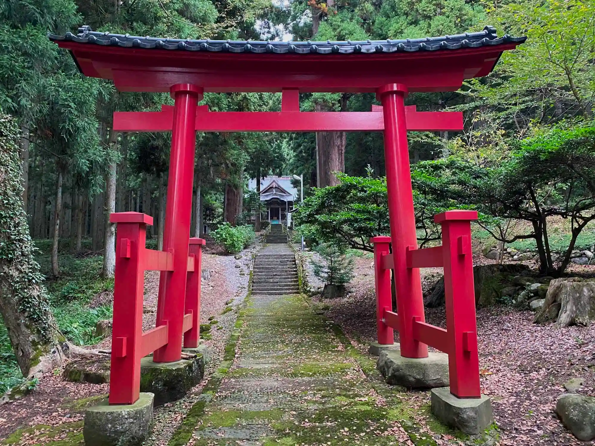 当社は、JR羽越本線・本楯駅の東方6kmの田んぼが広がる田園地帯の端にある小丘の上に位置している。麓の鳥居から細い階段を登って行くと突き当りに境内社があり、そこで90度左折してから長い参道を進むと社殿がある。境内全体が森の木々に包まれていて、閑静にして神聖な雰囲気に満ちている。本社の社殿も境内社の社殿も大きく、旧社格はワンランク上の旧県社相当。参道の階段の途中に宮司さん宅と思われる住宅があるが、ネット情報だと御朱印対応はしていない模様。
