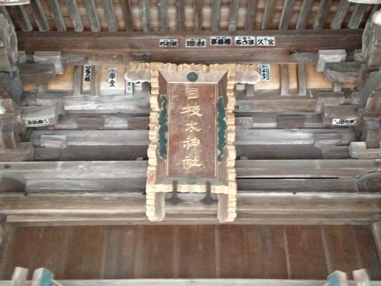 <拝殿>正面。扁額には<日枝太神社>の文字。木製扉の青銅製装飾金具のグリーンが美しく、重厚さの中に華やかさを増している。