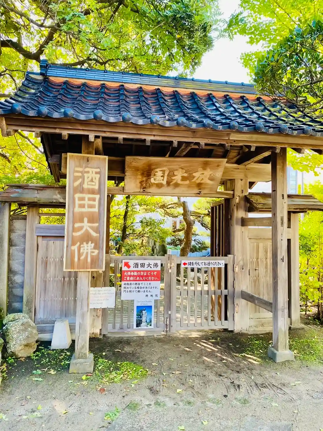 山形県酒田市に境内を構える、良茂山 持地院、酒田大仏が有名で寺院内に保育園が在りその敷地内に大仏様が街の人々を見守って居ます、2023.10.奥の細道みちのく路三十三ヶ所霊場巡り、出羽百観音、庄内三十三観音霊場巡りで参拝致しました、不在でしたが山形県の方々の対応は素晴らしく朱印等の対応等の心配は要りません問題無く頂けます。どの様な寺院か引用を用いて調べて見ました、山号は良茂山、寺号、院号は持地院、宗派は曹洞宗、ご本尊は釈迦牟尼仏、奥の細道みちのく路三十三ヶ所霊場、第十七番札所、庄内三十三観音霊場、第十番札所、荘内平和観音百八霊場、第二十一番札所、札所ご本尊は千手観世菩薩、出羽百観音の一つ、持地院の創建は応永2年(1395)に周囲を支配していた浦地勝太夫が開基となり報恩山永徳寺(岩手県金ケ崎町)2世の湖海理元和尚が開山したとされます。創建当時は小湊にありましたが長禄3年(1459)に浦地家が滅亡すると持地院も庇護者が無くなった事で酒田の方へ移転する事になり、さらに寛政9年(1798)に現地に移ってきます。持地院境内にある大仏は2代目で、当初は大正3年(1914)に日清戦争と酒田地震の被害者の鎮魂の意味を込め建立されたものでしたが、第二次世界大戦中に金属不足から軍に摂取され、現在の大仏は平成4年(1992)に新たに建立したもので像高13m台座を含めた総高は17mに達し金属製の立像としては日本一と言われています。札所本尊となっている千手観世菩薩像は慈覚大師円仁(平安時代の高僧、天台宗第3代座主)が彫刻したものと伝えられています。