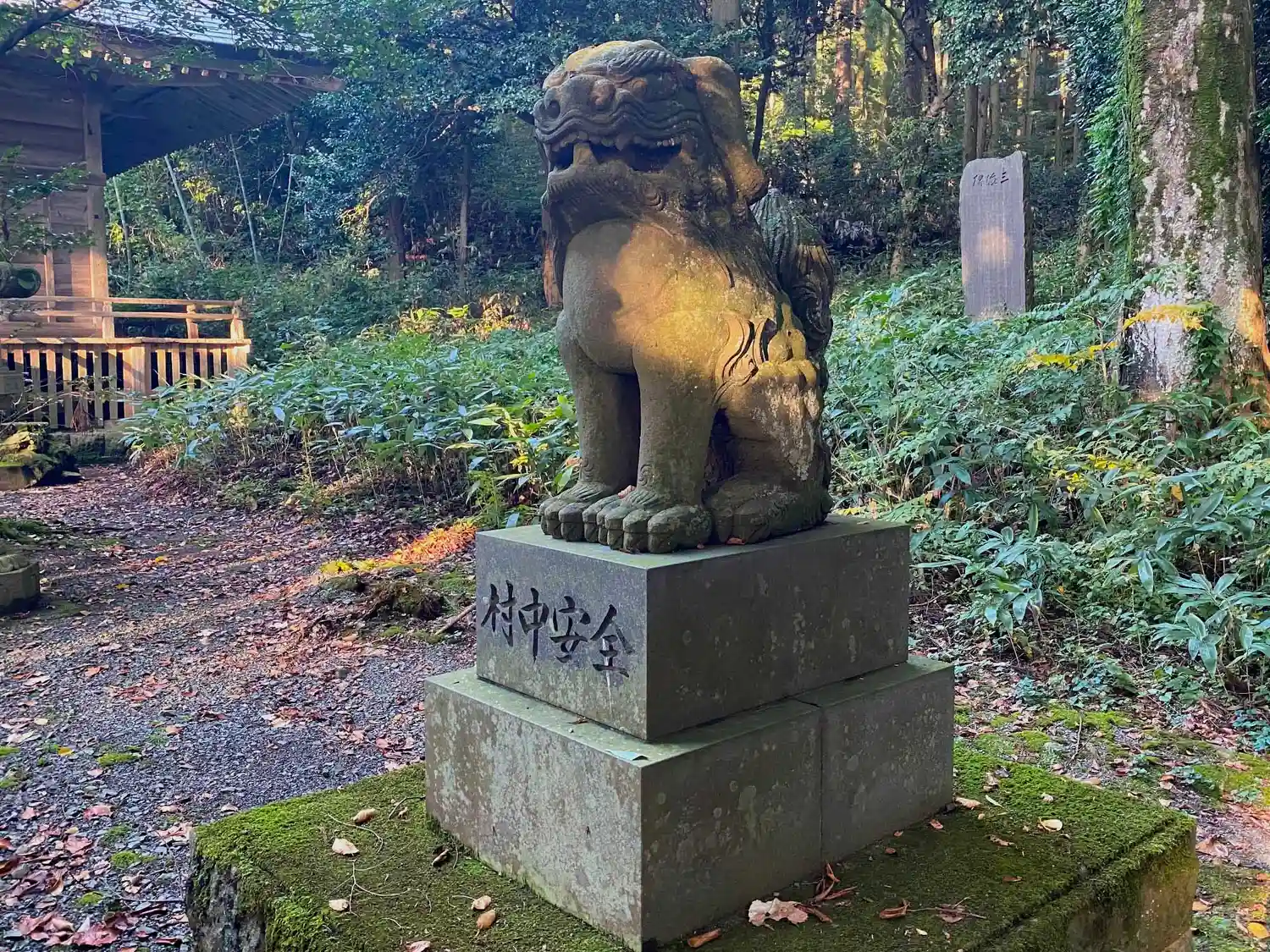 <狛犬>の台座は明らかに新しく、左右両方に<村中安全>の願いが刻まれている。