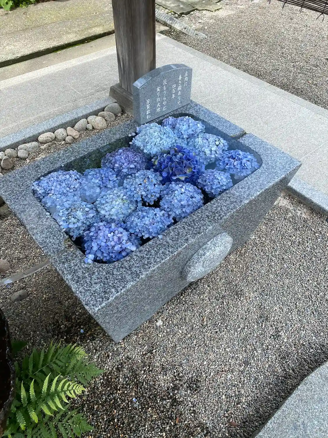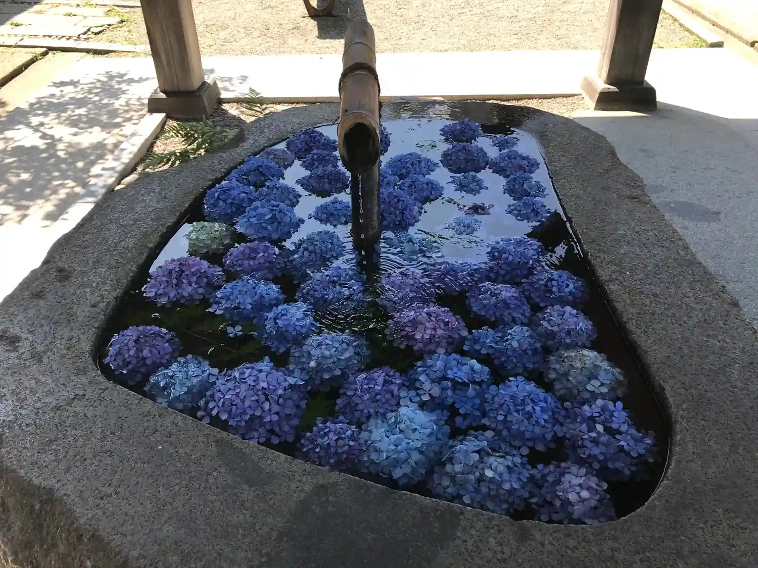 手水舎 紫陽花の色がアクセント