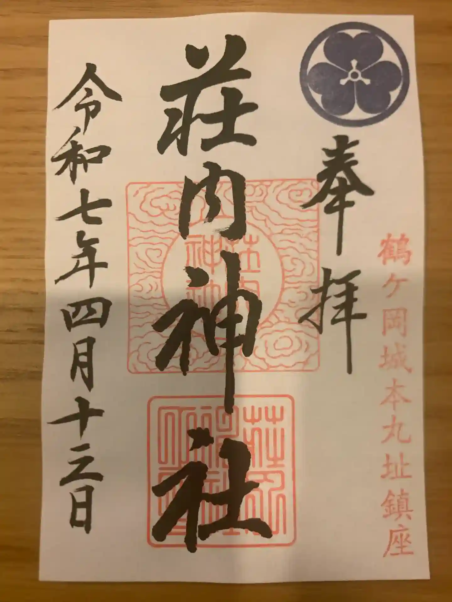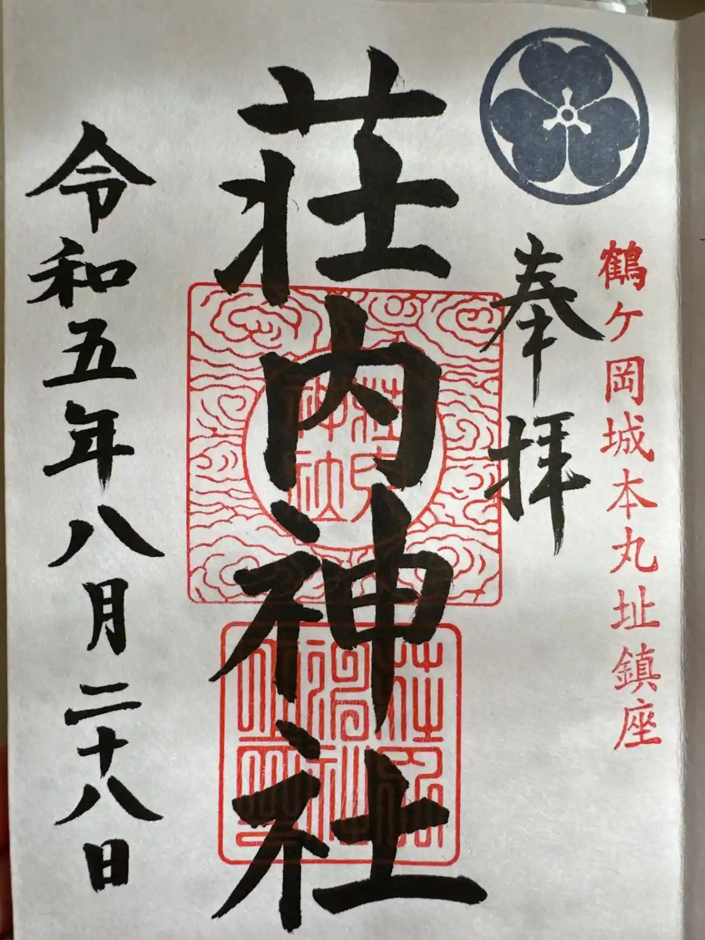 参拝後に社務所で鶴ヶ岡城の御城印と一緒にいただきました。