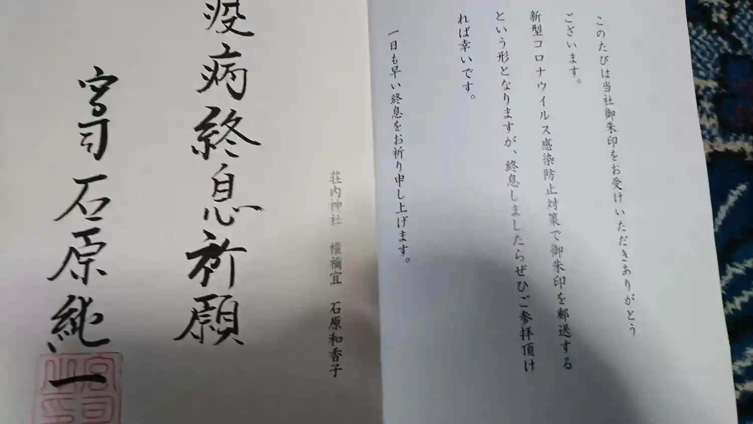 疫病終息祈願のお手紙も頂きました。