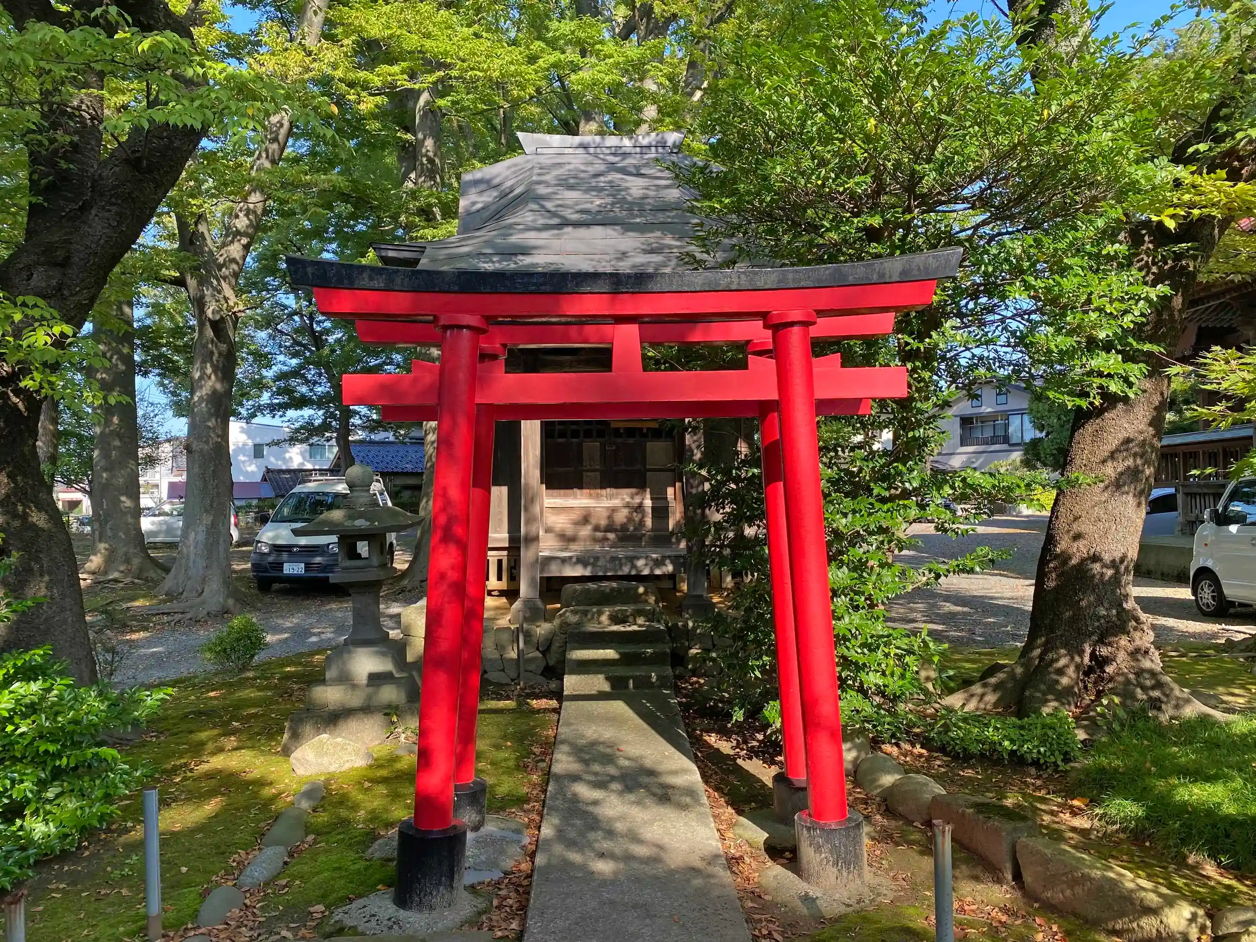 当社は、JR羽越本線・鶴岡駅の南方800mの市街地の中にある。大きめの道同士がクロスする交差点にあって、境内は広く、社殿も大きく、かつての街の中心と思わせてくれる規模がある。旧県社も納得。参拝時には、たまたま骨董市が開かれていたり、七五三の写真撮影をしていたりと、地域住民の日常生活に溶け込んでいるように感じた。