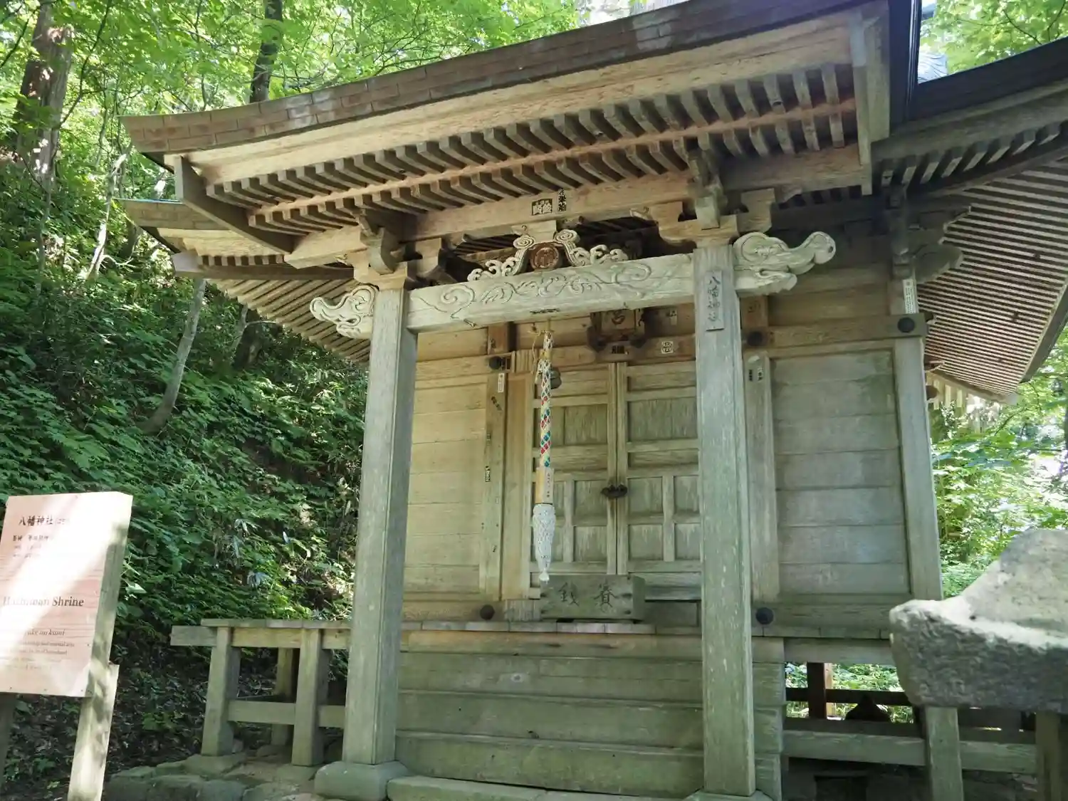 <三神合祭殿>は、月山、羽黒山、湯殿山の三神を一堂に祀る社殿で、拝殿と本殿の一体型。江戸時代後期の1811年に焼失し、1818年に再建されている。国指定の重要文化財。茅葺の木造建築物としては日本最大で、茅葺屋根の厚さはなんと2.1mもあるとのこと。(;゚Д゚)