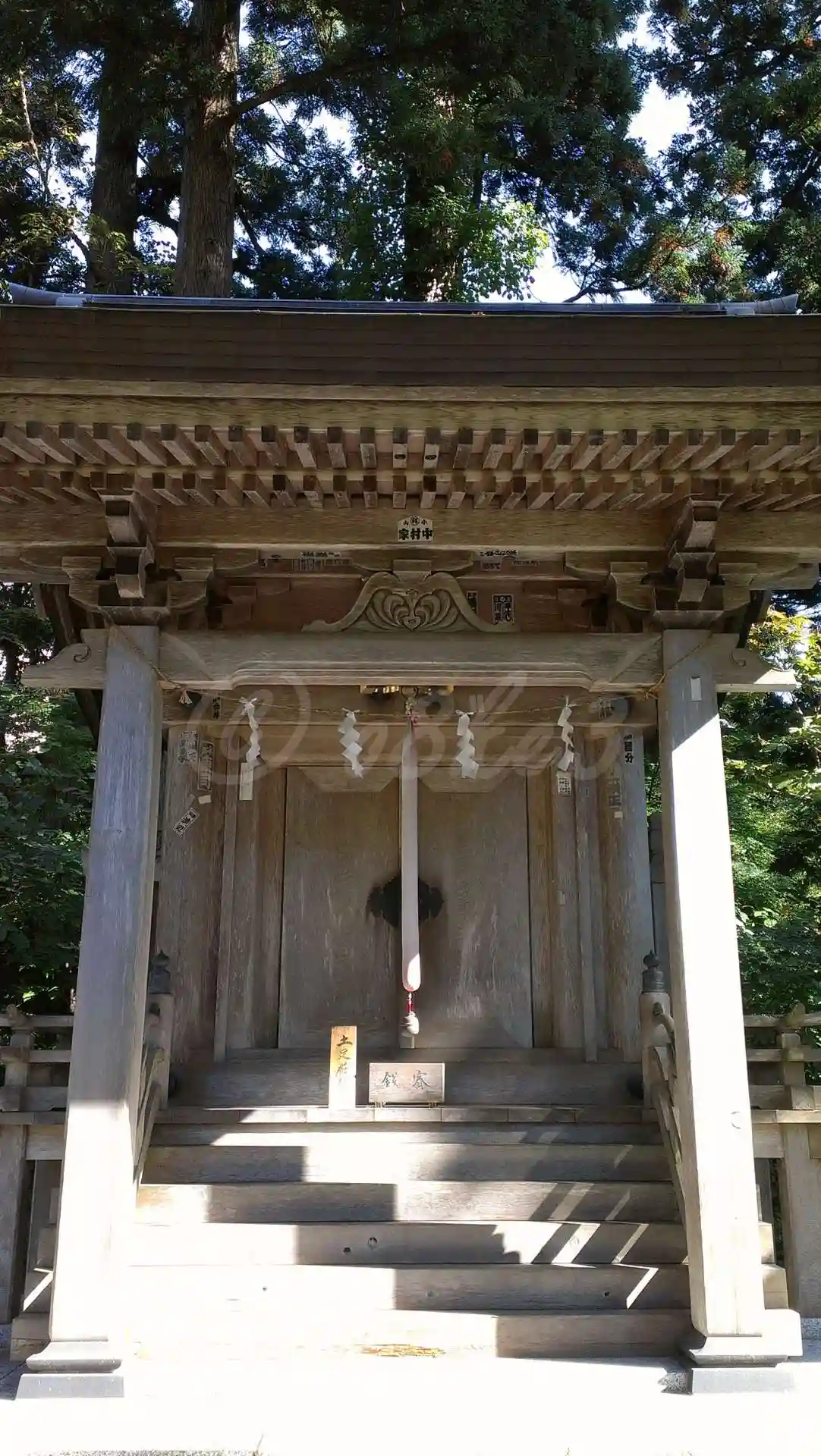 左から順に<湯殿山神社>、<月山神社>、<出羽神社>の3社の扁額が掛かっている。参拝順序としては右の出羽神社、続いて月山神社、湯殿山神社とされる。