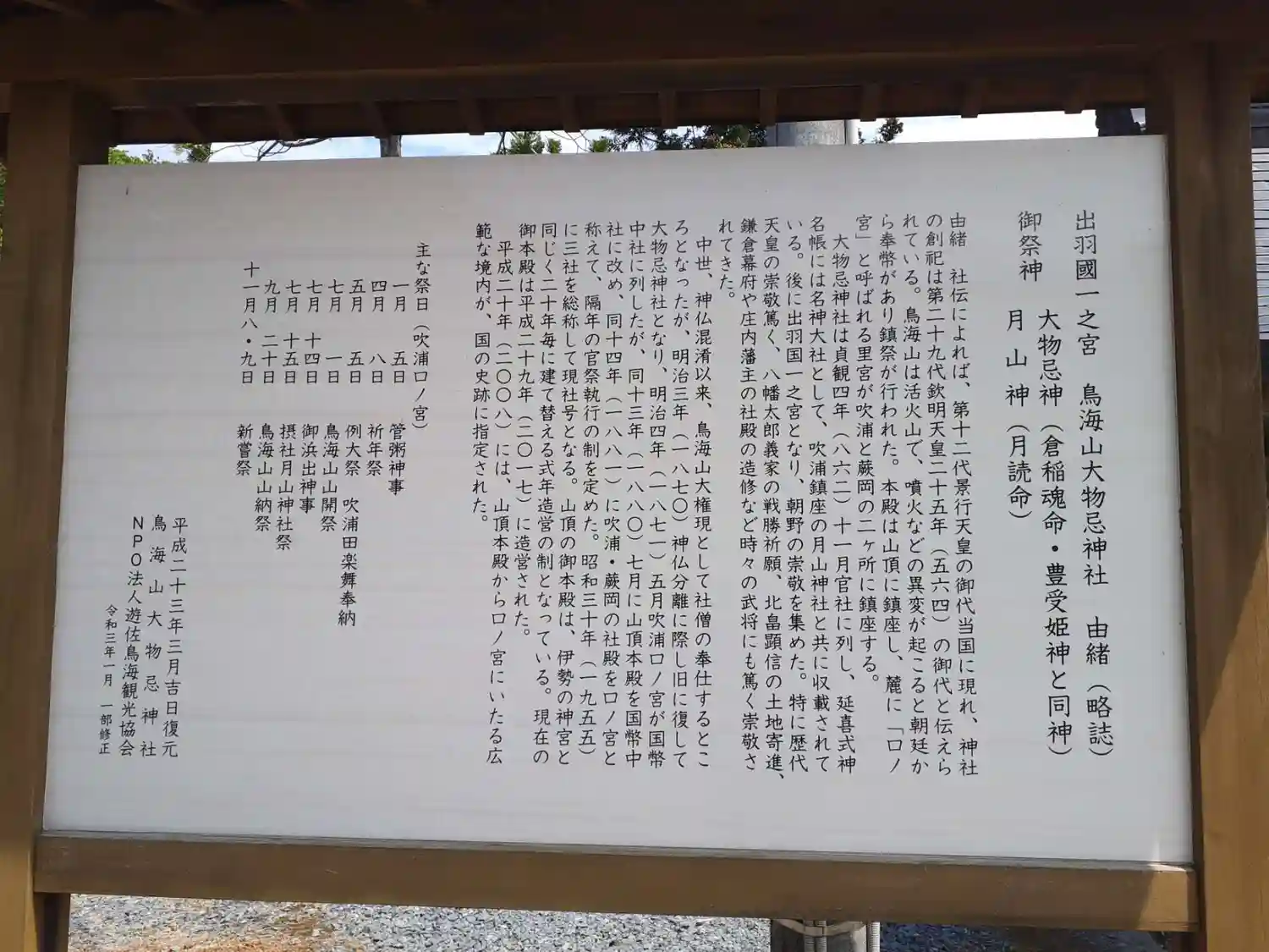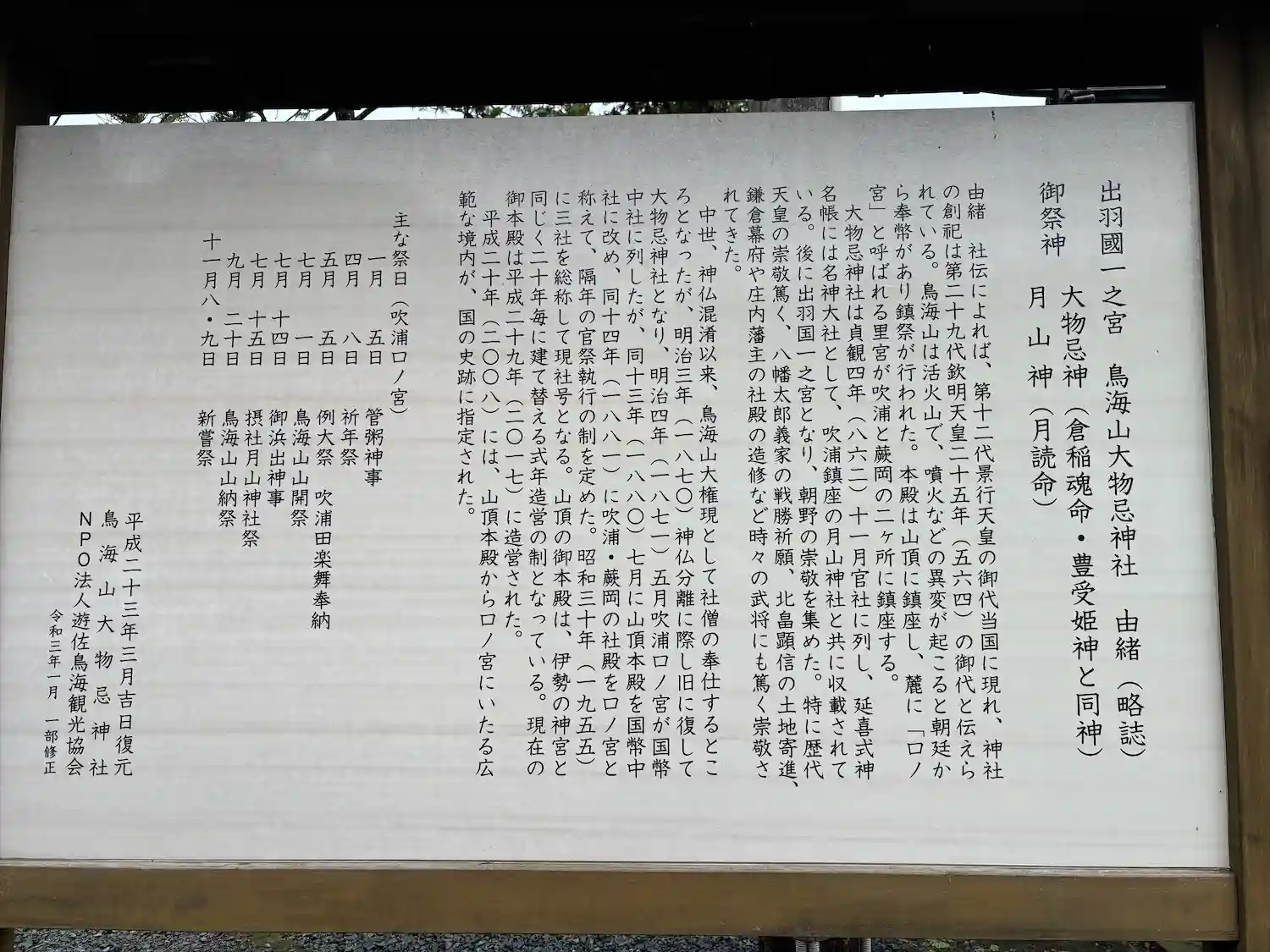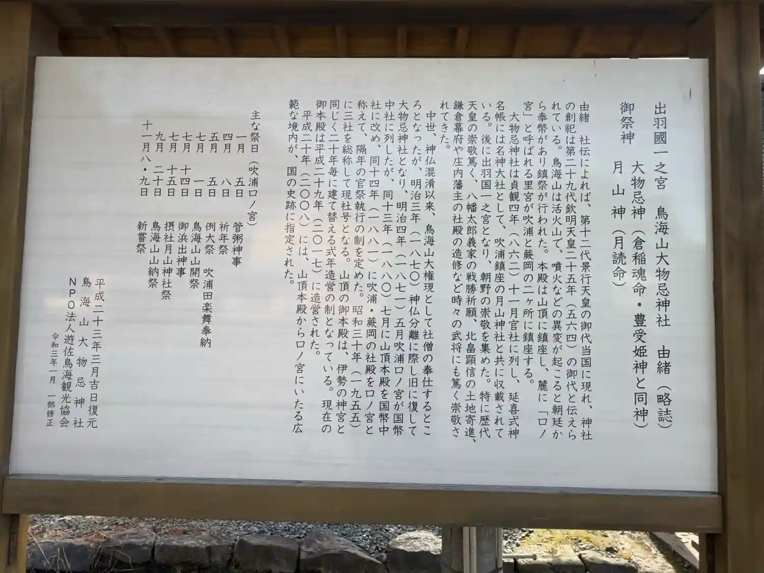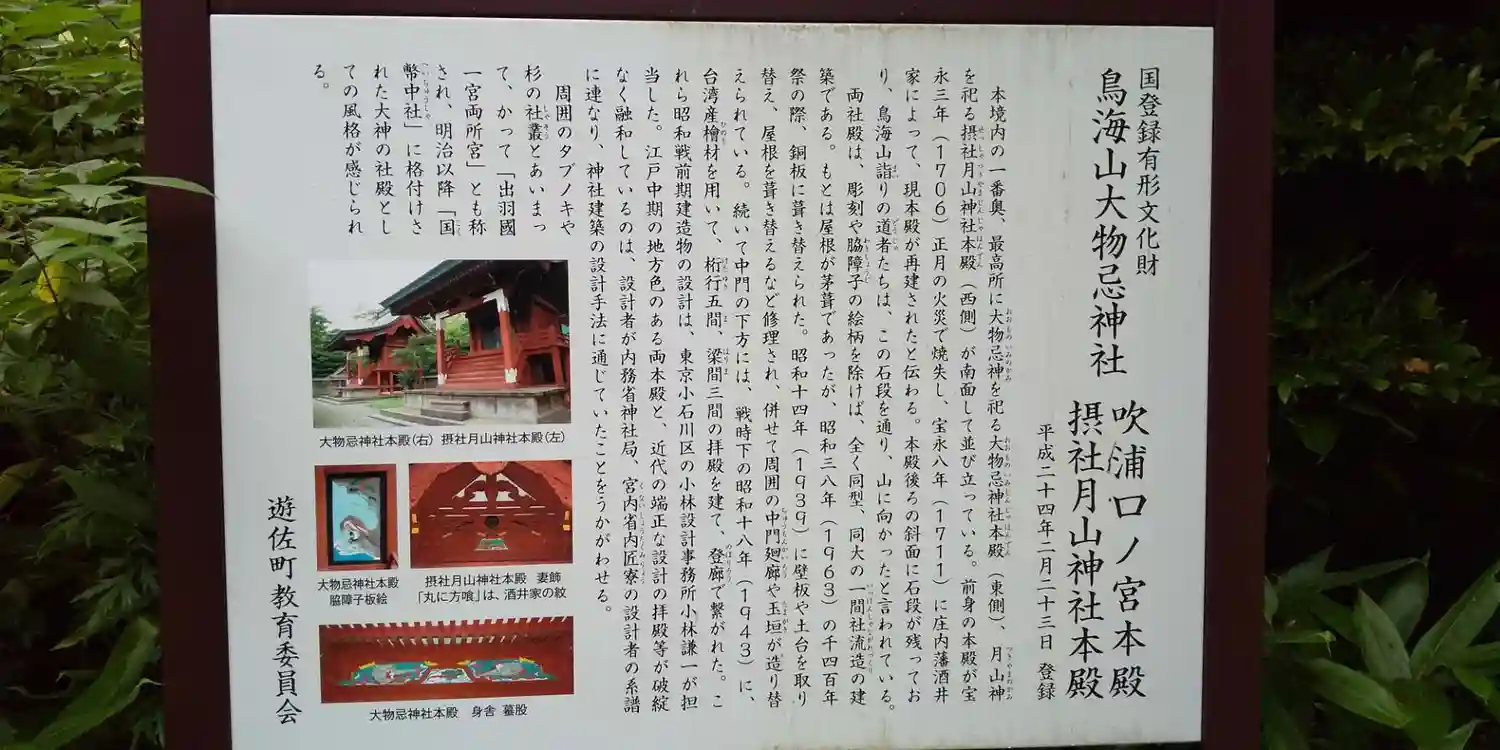 鳥海山頂の本社と、麓の吹浦と蕨岡の2か所の口之宮の総称として大物忌神社と称しま…