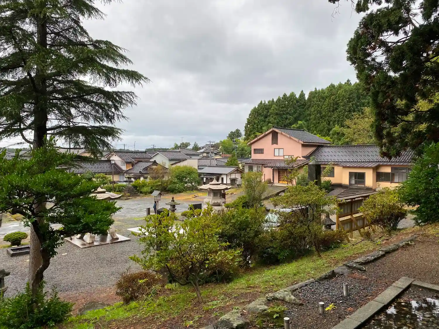 下拝殿の参拝位置から社殿に向かう参道へと横スライドする時に見える境内の景色。奥は斎館など。