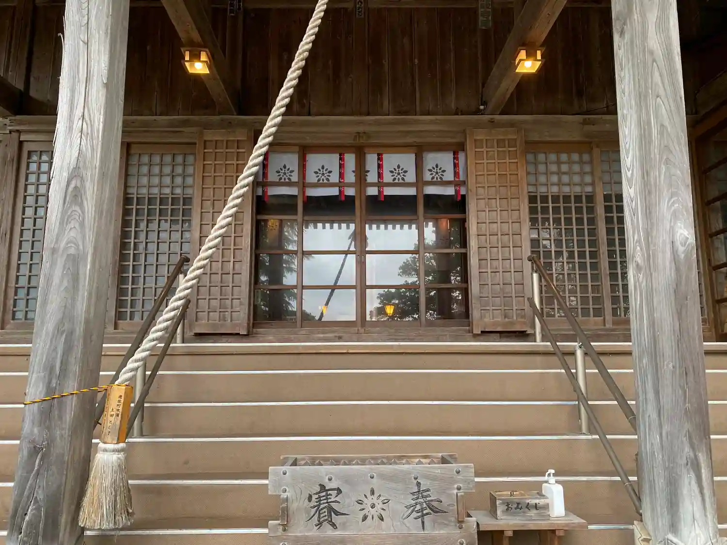 <下拝殿>正面。拝殿内部が高い場所にあるのでよく見えない。灯りが点いているのだけが分かる。