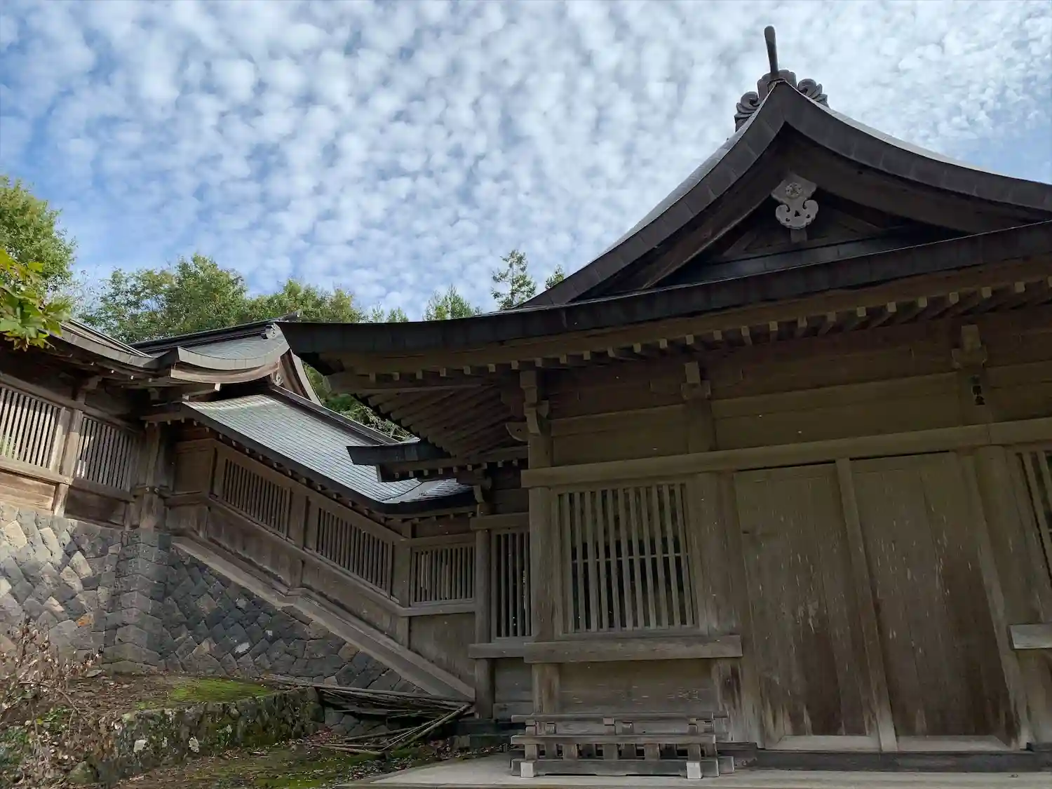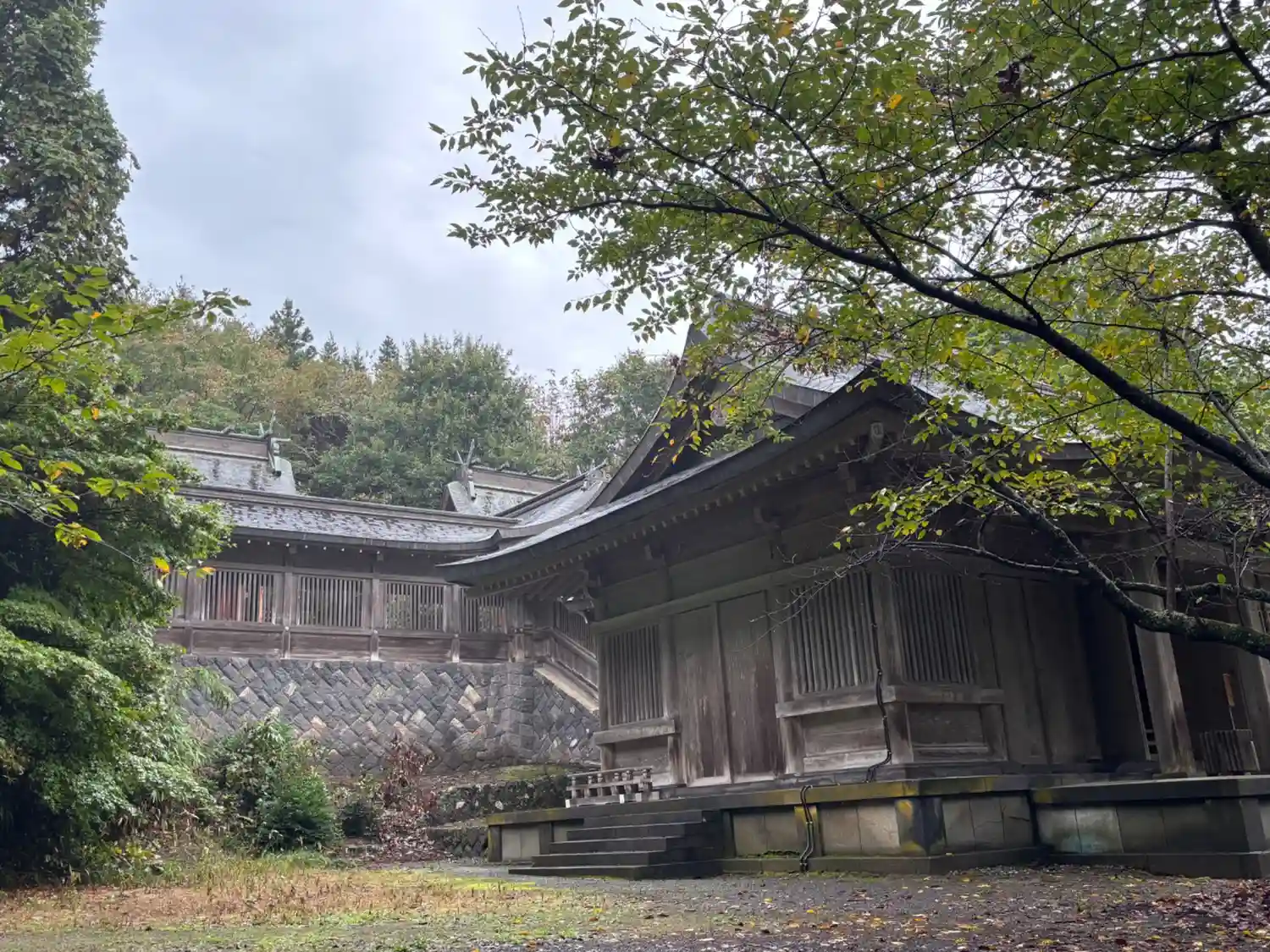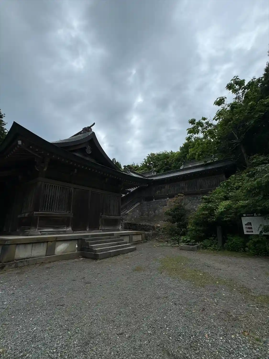 斜めから拝殿を撮影しようと移動してみると、拝殿の後ろの高い場所には立派な建物が。ここから眺めてやっと一之宮らしい豪壮さを感じる。
