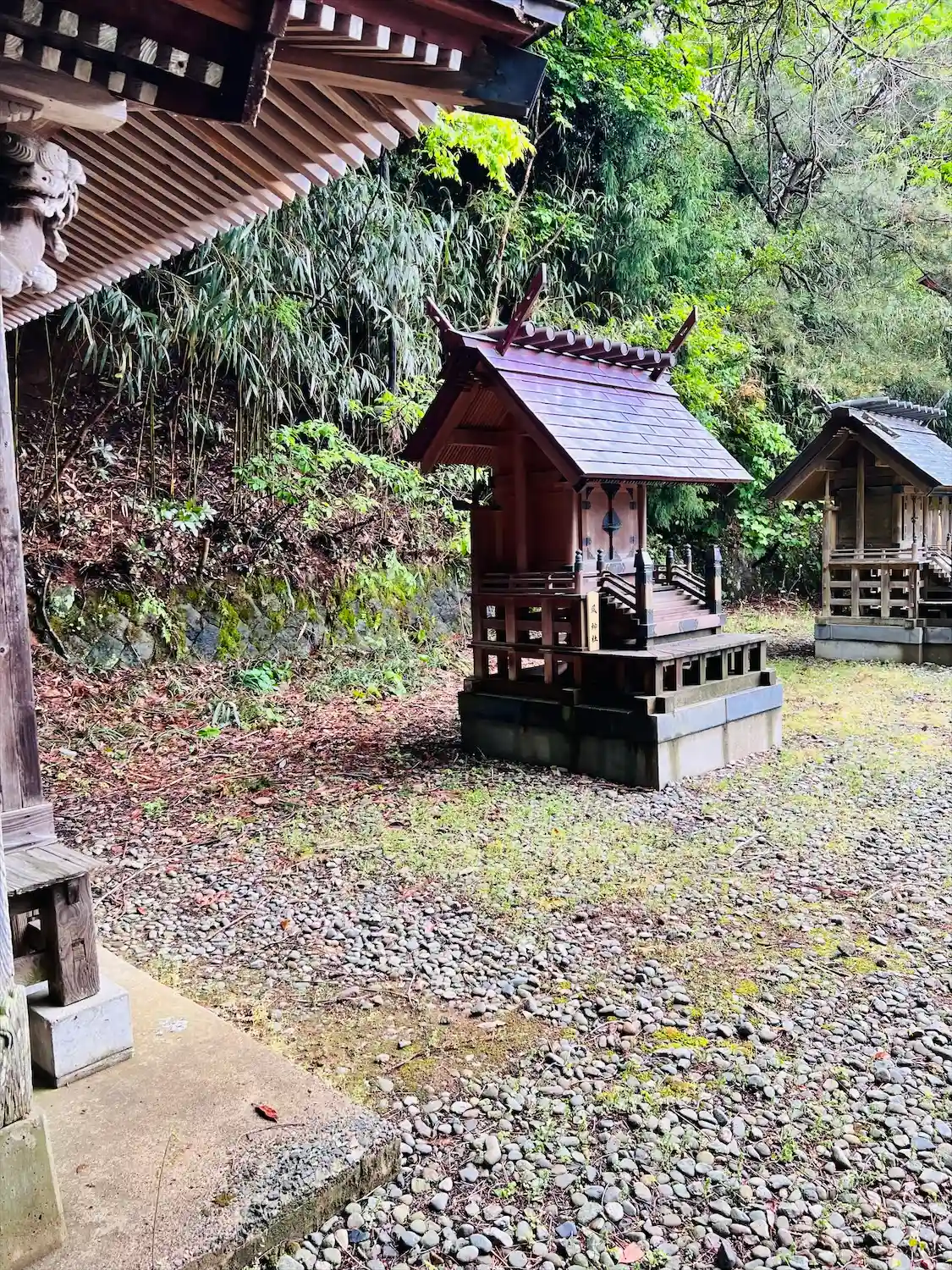 階段を登ると本殿があります。摂社の社殿も朱色がすてきでした✨