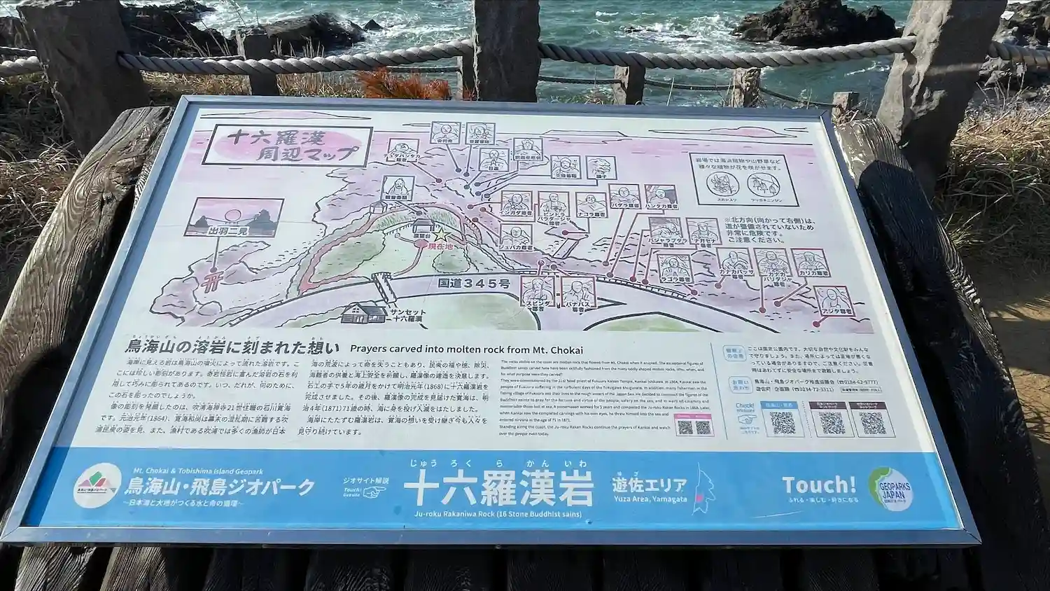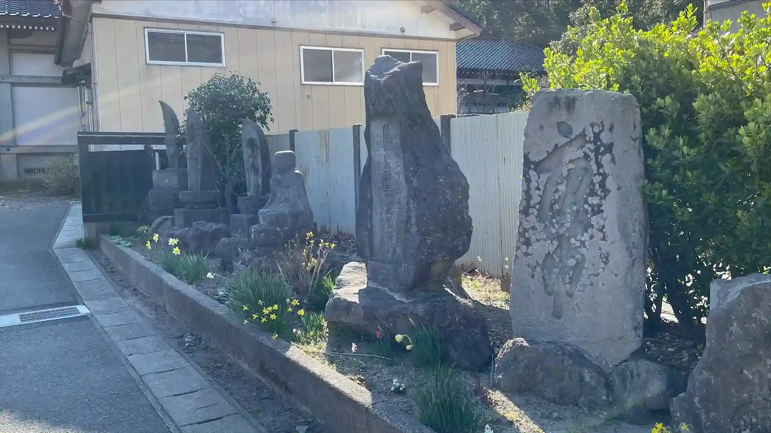 近隣には第21世住職大法寛海が海上の安全と海難者供養のために掘られたという海岸添いの天然石に釈迦三尊、十六羅漢がある。