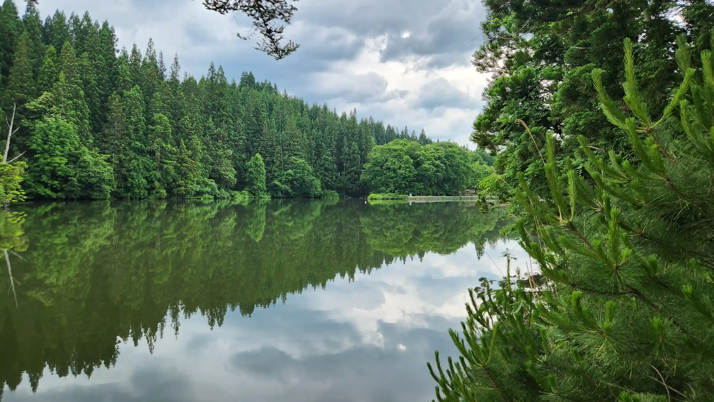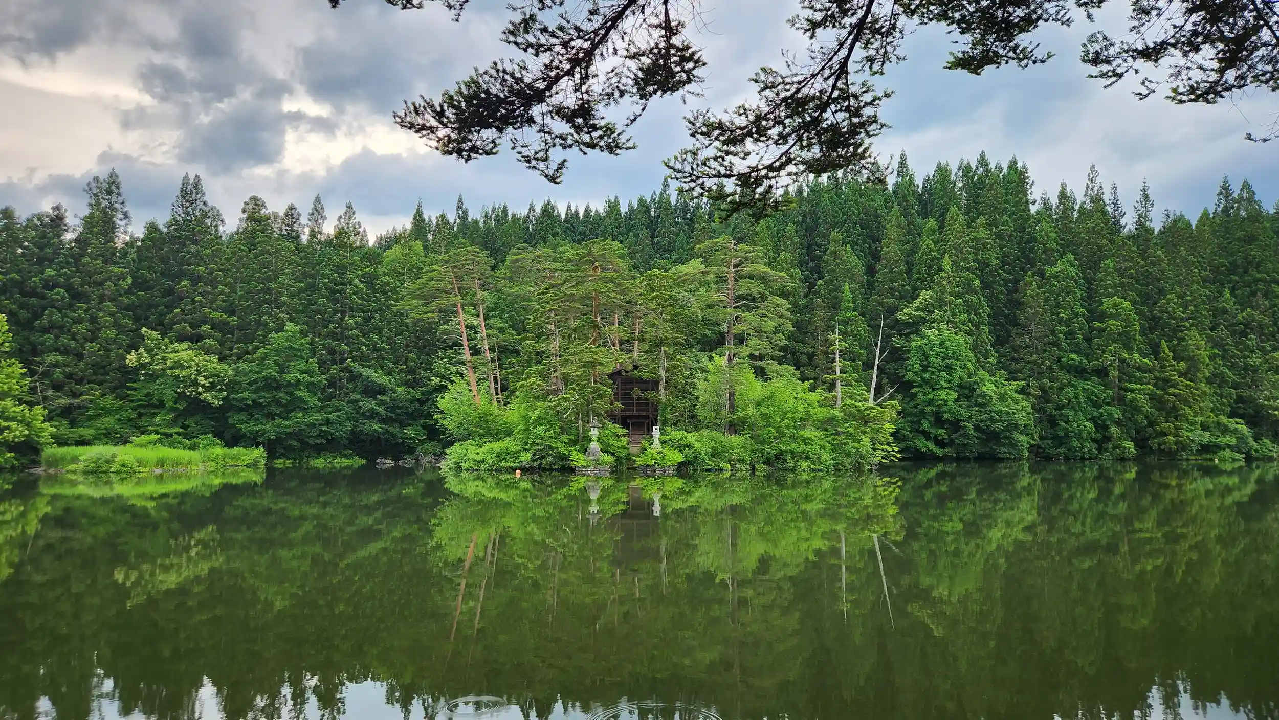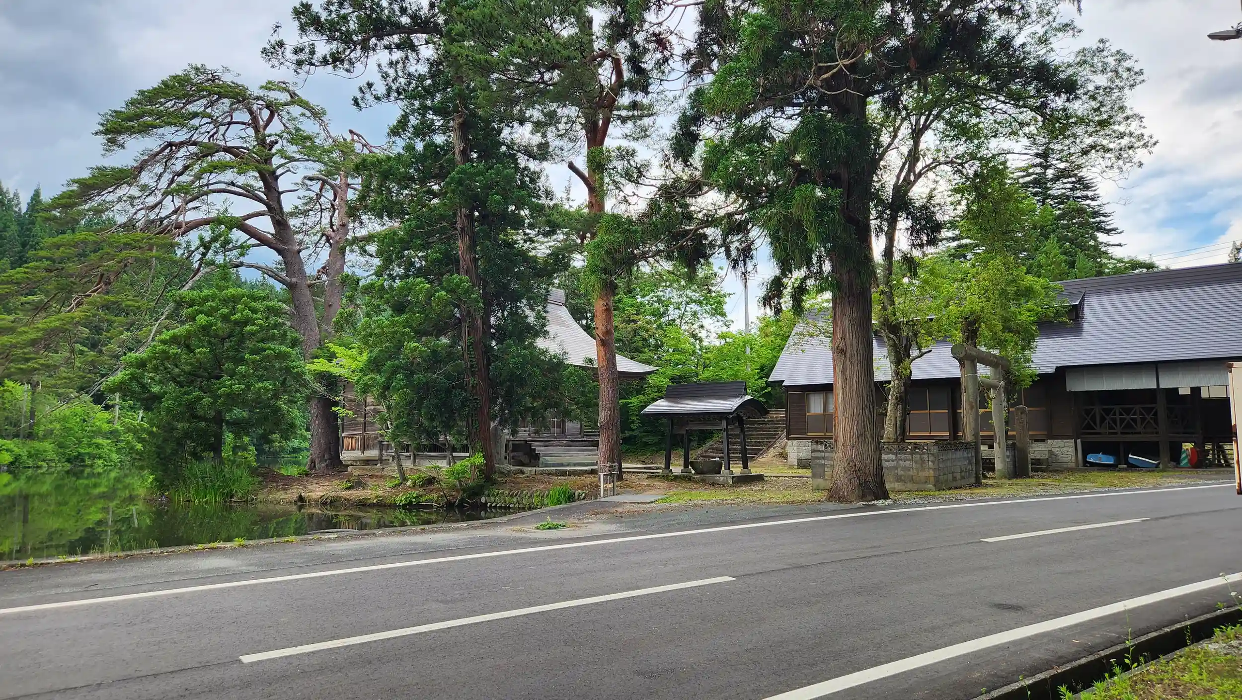 長沼は幹線道路からずっと山側に入ったところにあり、満々と水を湛えた、地元の高校生や家族連れが魚釣りを楽しむような静かな湖です。その湖の畔に神社の入口があり、「郷社 大沼神社」という社号標を見ても、始めは極々普通の造りの社殿と思い、気楽に参拝し社殿の写真などを撮っていました。ところが本殿を撮ろうと奥に回り込むと対岸にまだ社殿が見えるではありませんか。おまけにこちら側にはいなかった狛犬の姿も見えます。慌てて夫に知らせ、対岸に回り込みましたが、実は対岸と思っていた場所は湖に浮かぶ中の島でした。こちら側からも船がない限り社殿近くまではいけません。