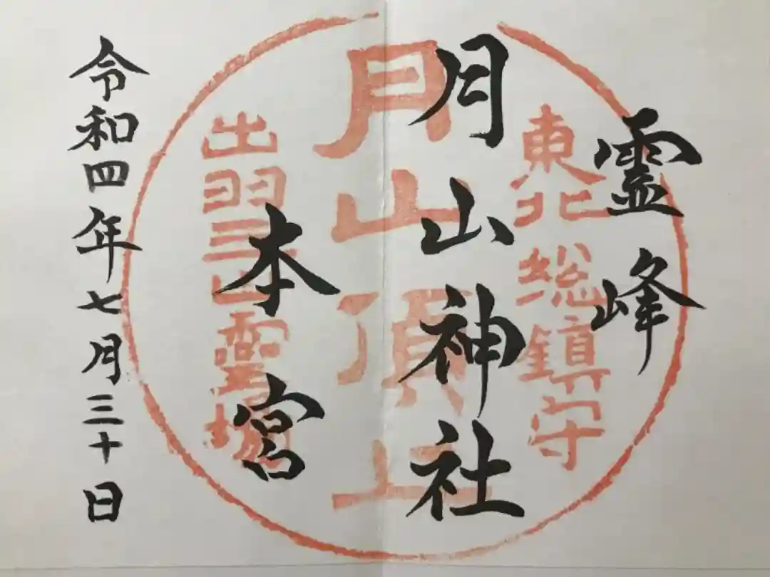 二面見開きの御朱印です。右に霊峰、真ん中に月山神社本宮と書かれ、東北総鎮守月山頂上出羽三山霊場の印が押されています。