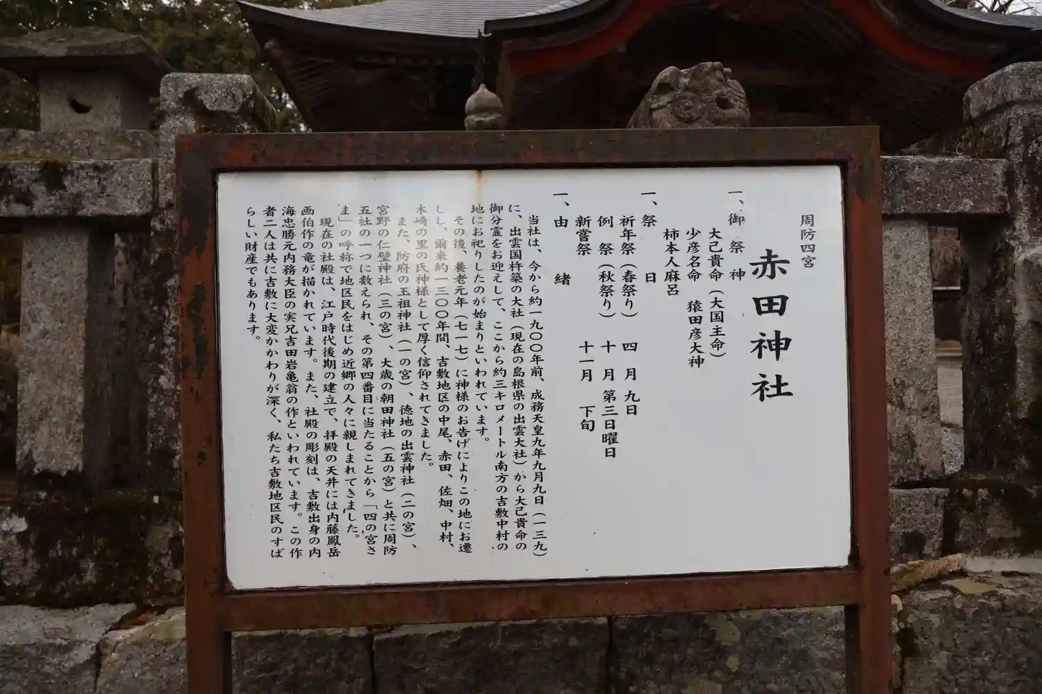 赤田神社は、山口県山口市吉敷に鎮座します。139(成務天皇9)年、島根県の出雲大社から大己貴命(大国主命)の御分霊をお祀りしたのがはじまりとされています。防府の玉祖神社(一の宮)、徳地の出雲神社(二の宮)、宮野の仁壁神社(三の宮)、大歳の朝田神社(五の宮)と共に周防五社の一つに数えられ、その第4番目に当たることから「四の宮さま」の名で呼び親しまれています。