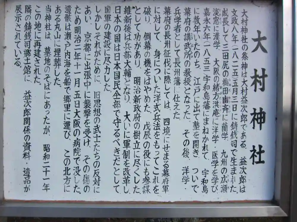 ご祭神は大村益次郎。靖国神社に銅像があると聞きますが未参拝です。近くの資料館で遺品などをみることができますよ😊