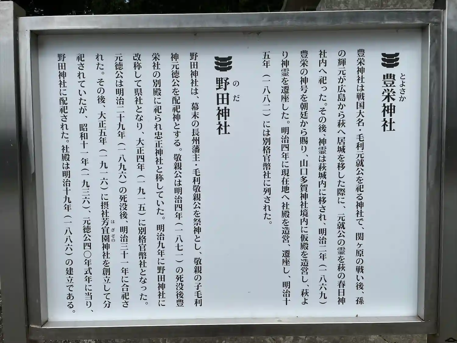ご祭神は、長州藩最後の藩主で明治維新の功労者である毛利敬親と敬親の養嗣子の元徳。元別格官弊社ですが…