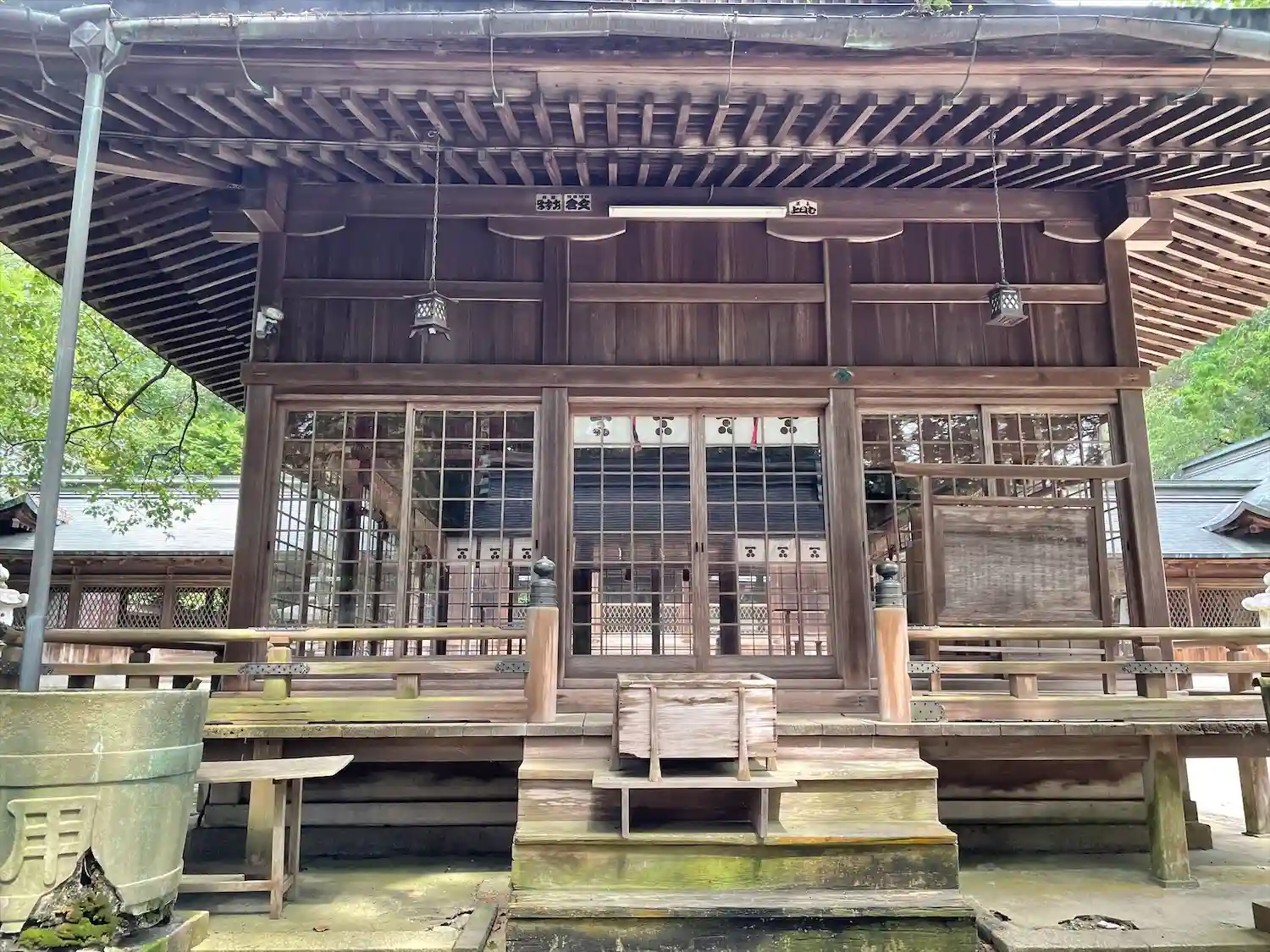 拝殿 拝殿前の雨水桶は明治十九年(1886)年寄進(小野田セメント製)