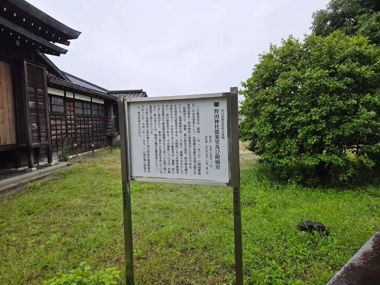 昭和11年(1936)毛利元徳の長男である元昭により新築寄進された能楽堂(市有形文化財)一の鳥居近くにありますが、建築当初は少し西、現在の野田学園運動場にありました