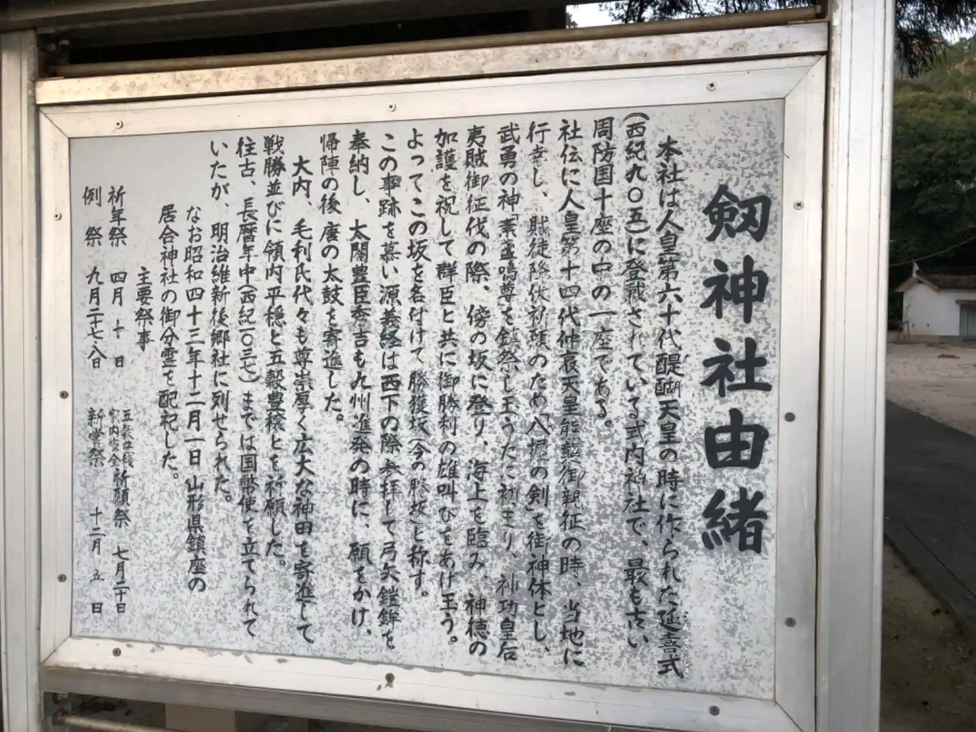 周防国式内社です。御神体が剣だったことが社名の由来であり、伝説によると仲哀天皇が熊襲調伏に向かう際に、「八握の剣」を奉納し、須佐之男命を鎮祭したのが始まりです。その後は源義経や豊臣秀吉が、西征に行くたびに勝利の願を掛けに訪れたという神社です。