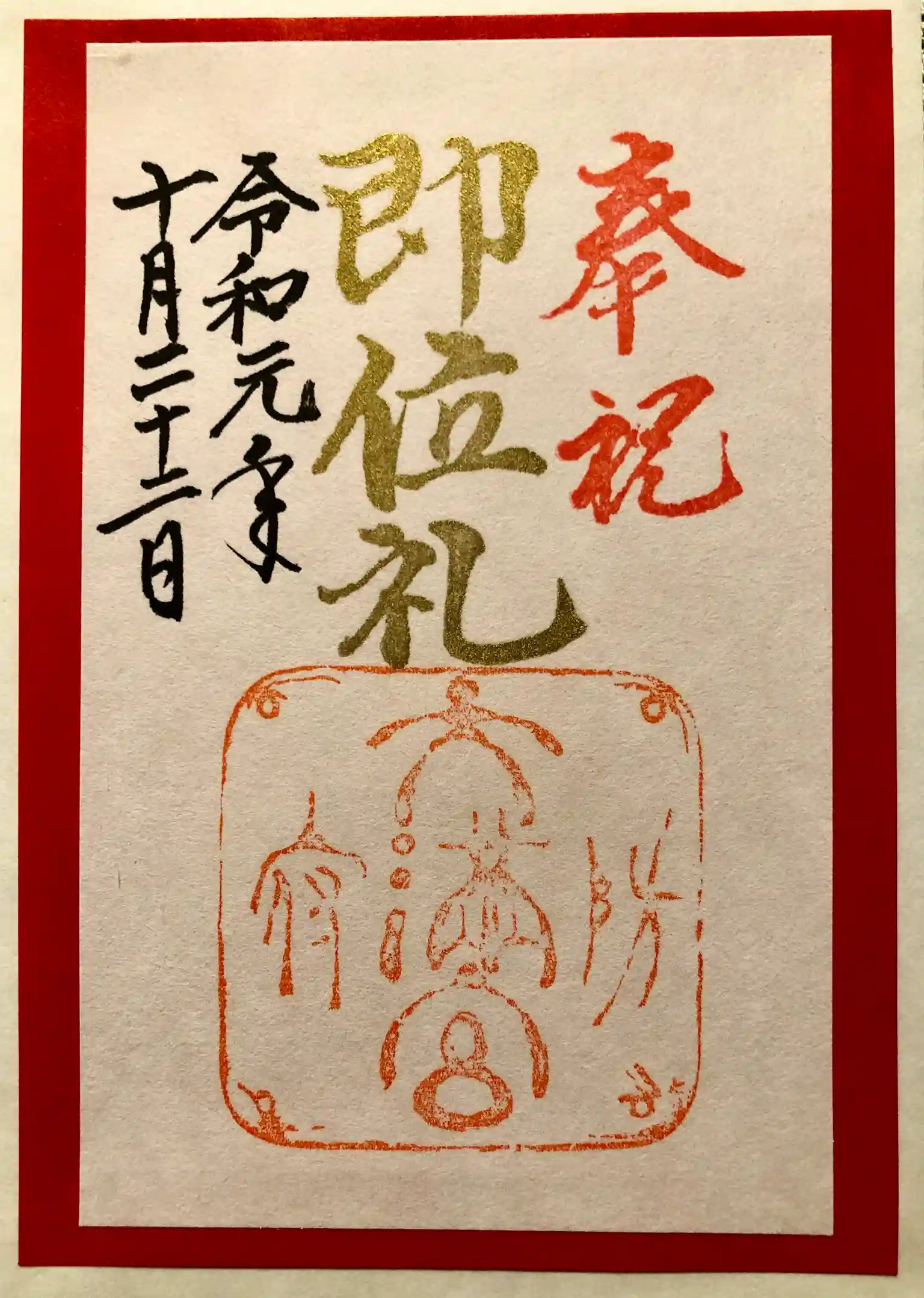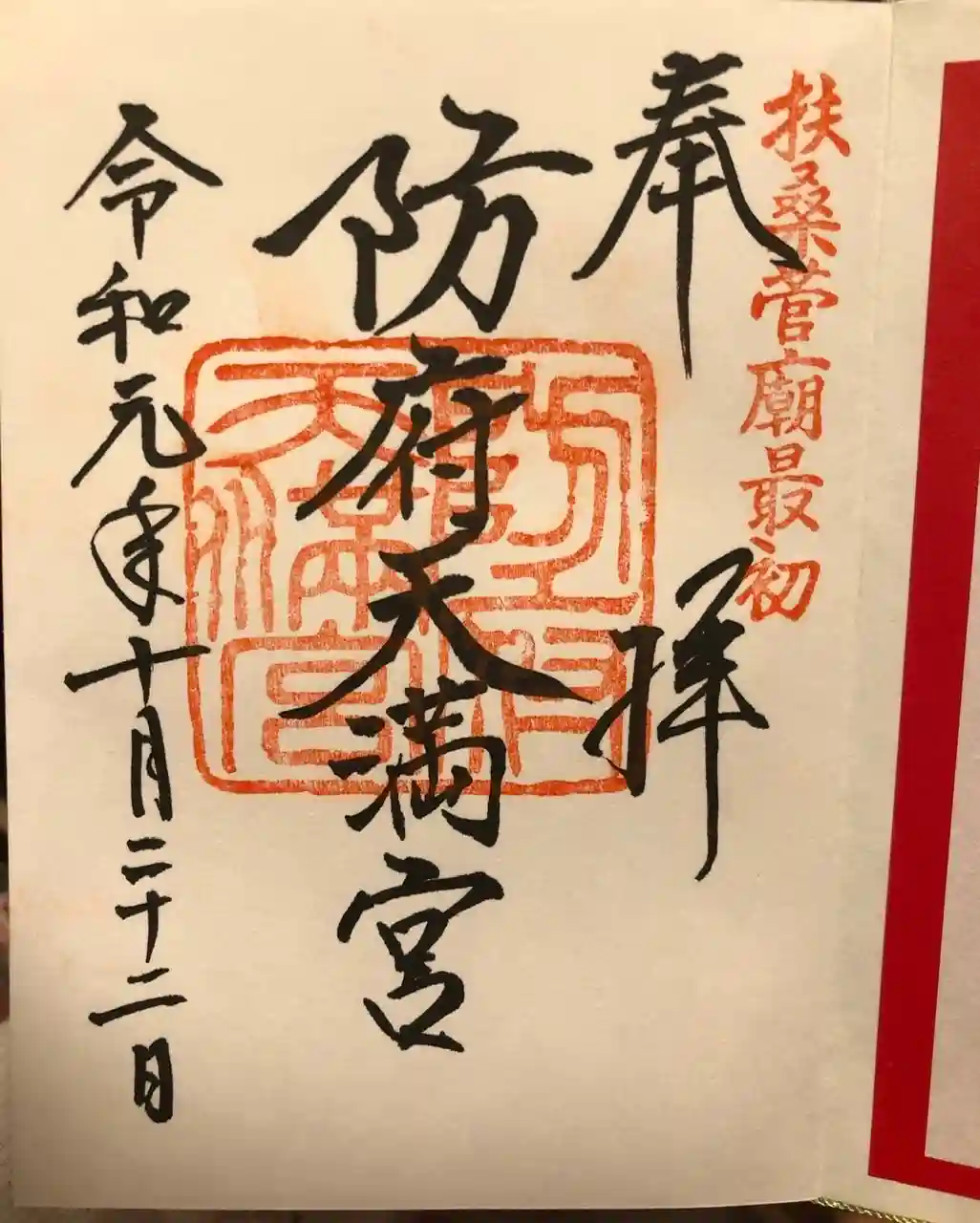 防府天満宮を参拝の折、即位礼限定の御朱印を頂きました。