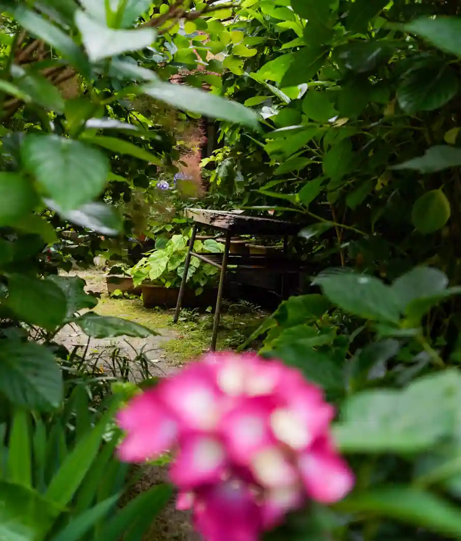 紫陽花の奥のテーブルが少し寂しそう