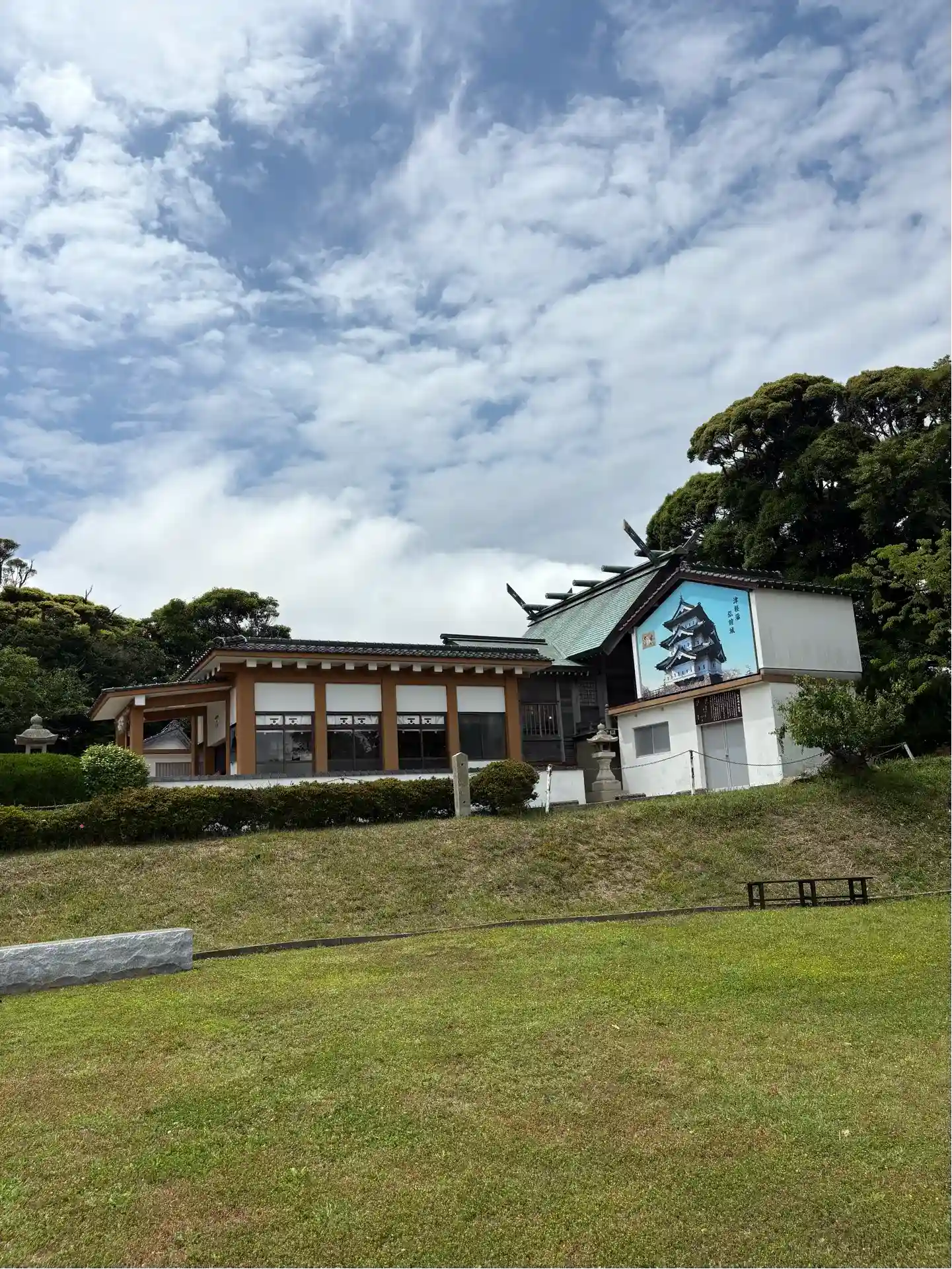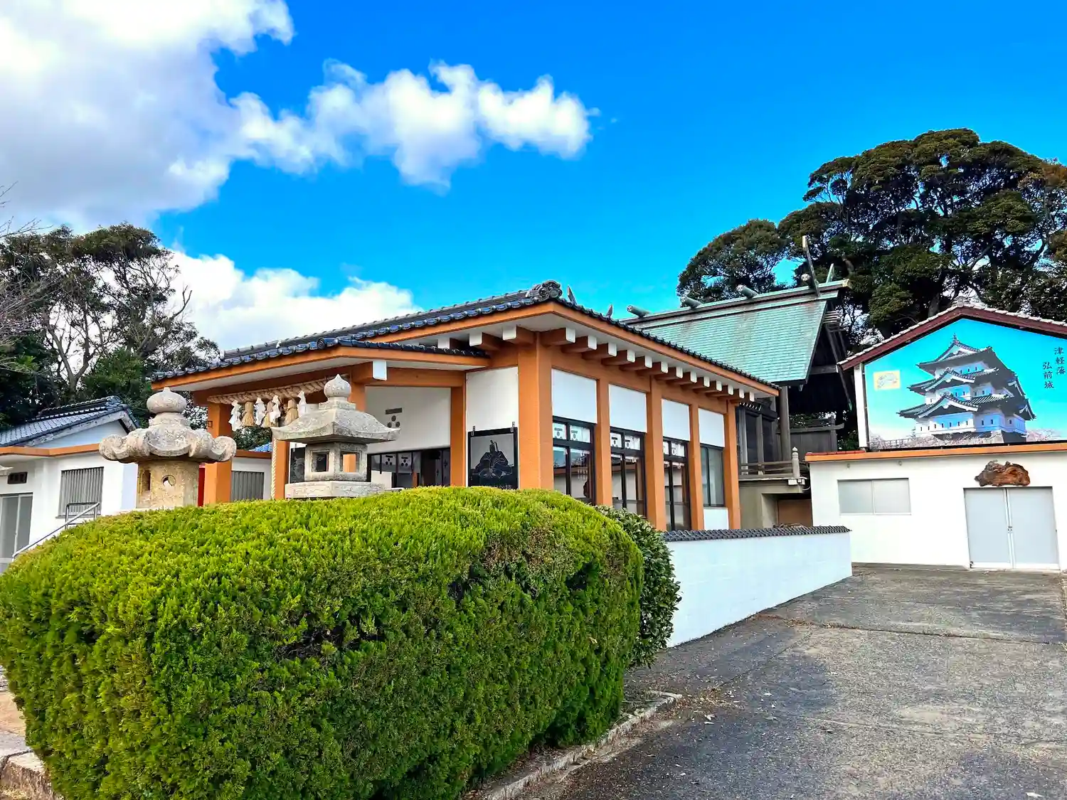 なぜか「津軽藩弘前城」の巨大写真があるので調べてみると、長府藩毛利家の女性が津軽宗家に嫁いだことに因むらしい。