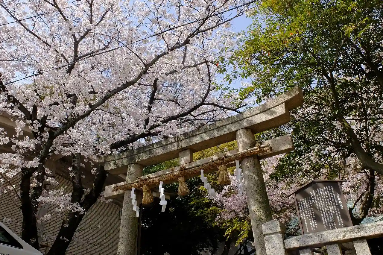 社務所の左手、瑞垣の外にある<八坂神社>の鳥居。