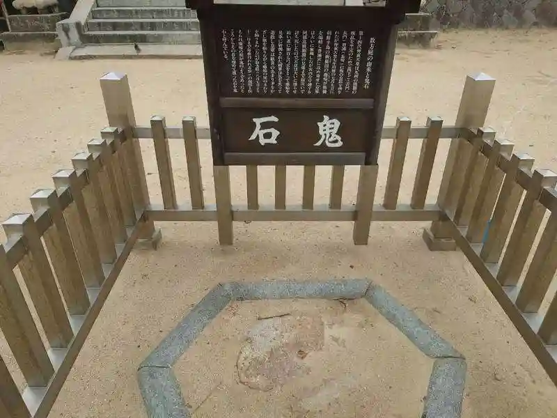 神門前の階段の手前にある<鬼石>。熊襲平定のため豊浦宮を建てた仲哀天皇が、攻め込んできた新羅国・塵輪(じんりん)を弓で射殺した。塵輪の首を埋めて覆ったのがこの「鬼石」で、その名称は塵輪の顔が鬼のようであったことに由来するとのこと。