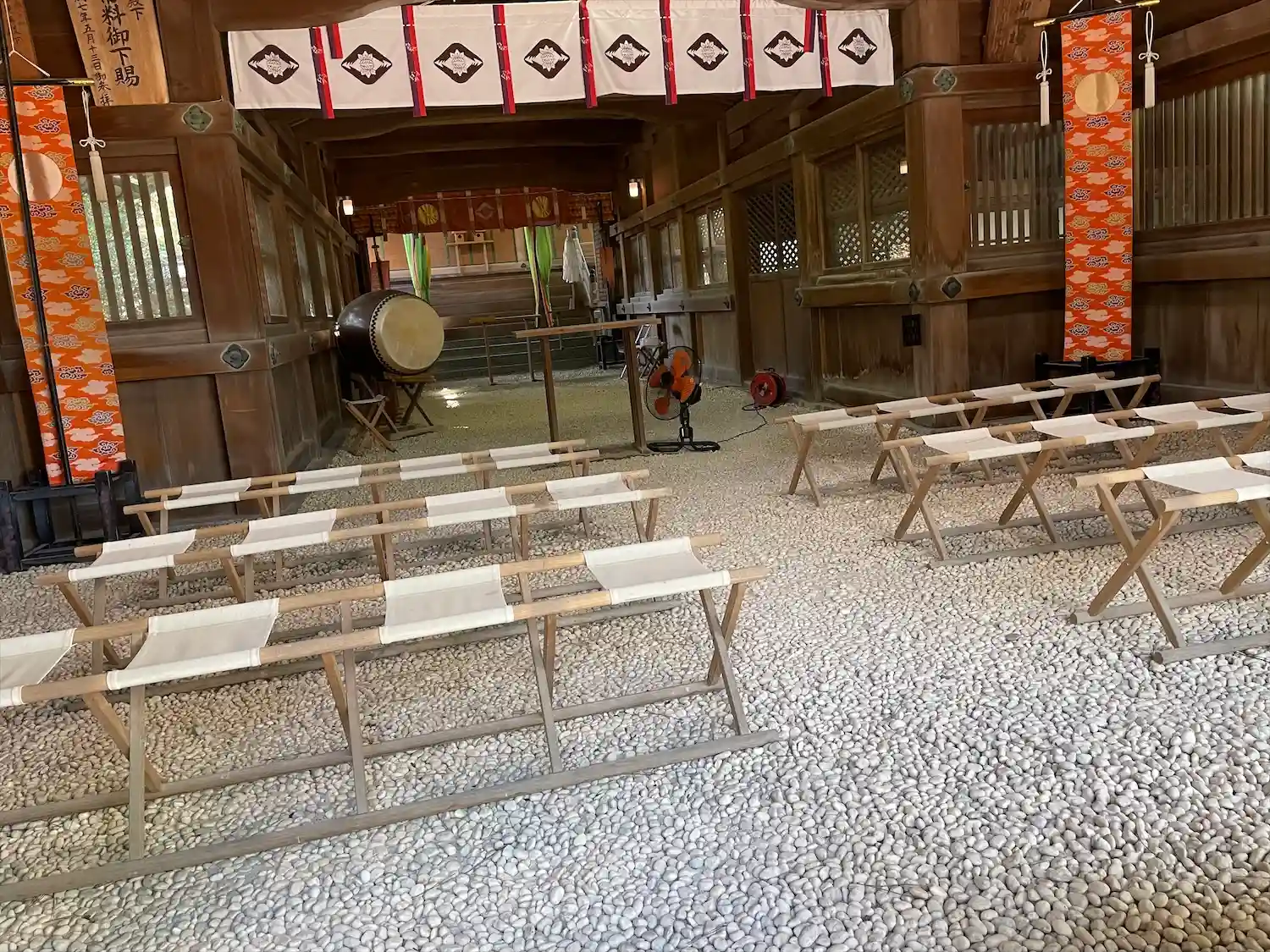 拝殿内部は床でなく珍しい玉砂利を敷き詰めたものでした。 昔伊勢神宮に憧れ模したらしいとの事。