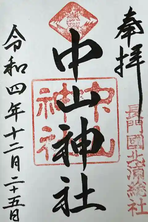 創建は江戸時代末期の1865年、幕末に尊王攘夷の立場で活動し前年に暗殺された公家の中山忠光公を祭神として祀る「中山社」の社殿を建てたのが始まり。1875年以降、祭祀及び修繕費などが官費支給となっている。一時社号を廃し「招魂社」となり、幾度か社地を遷座するが、1923年に現在地に遷座、1928年には社号を「中山神社」とし、県社に列格している。