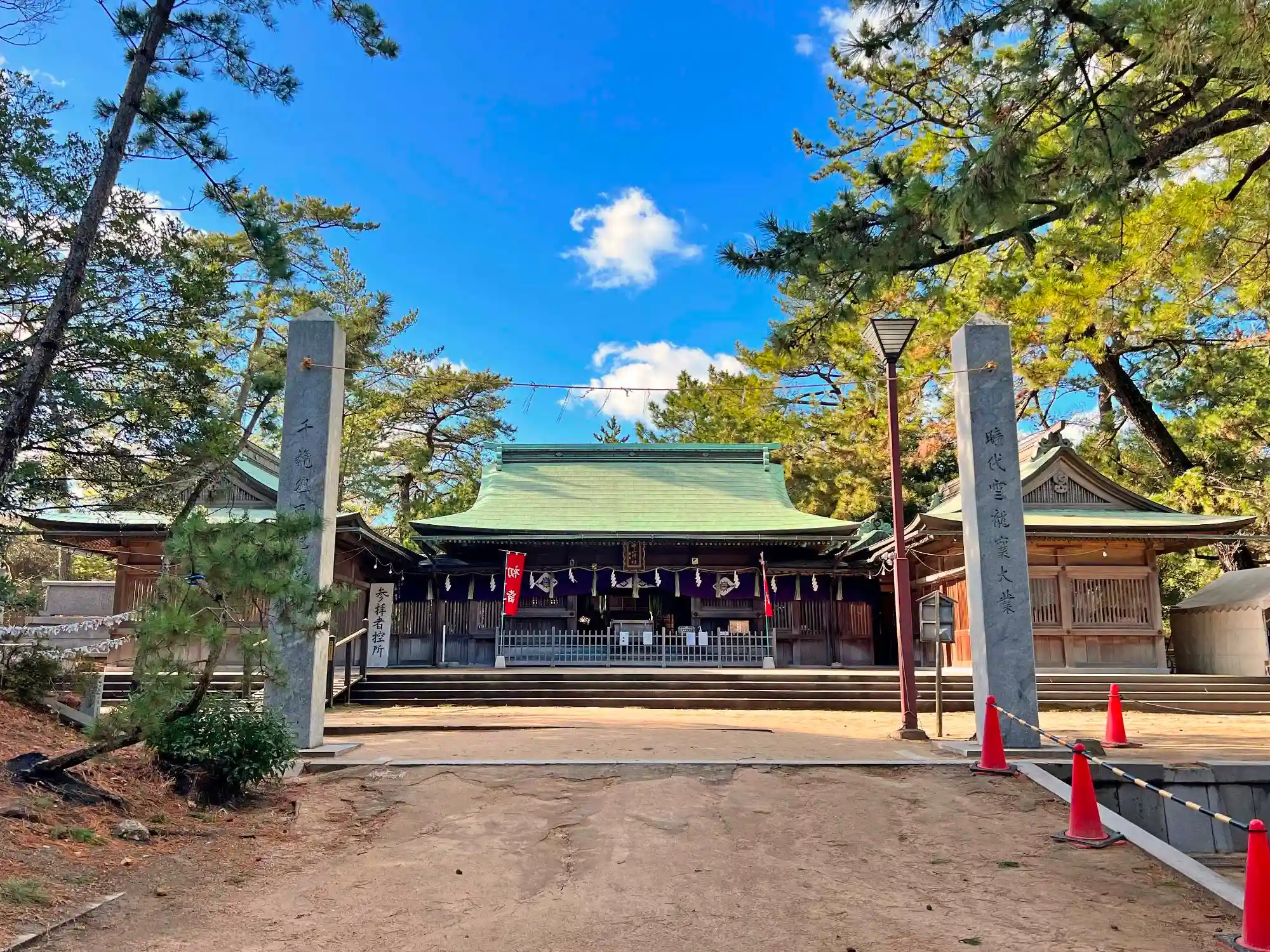 参道を進むと、少し高いところにある<拝殿>。拝殿の両側は、左右に対称的な翼殿を備えている。