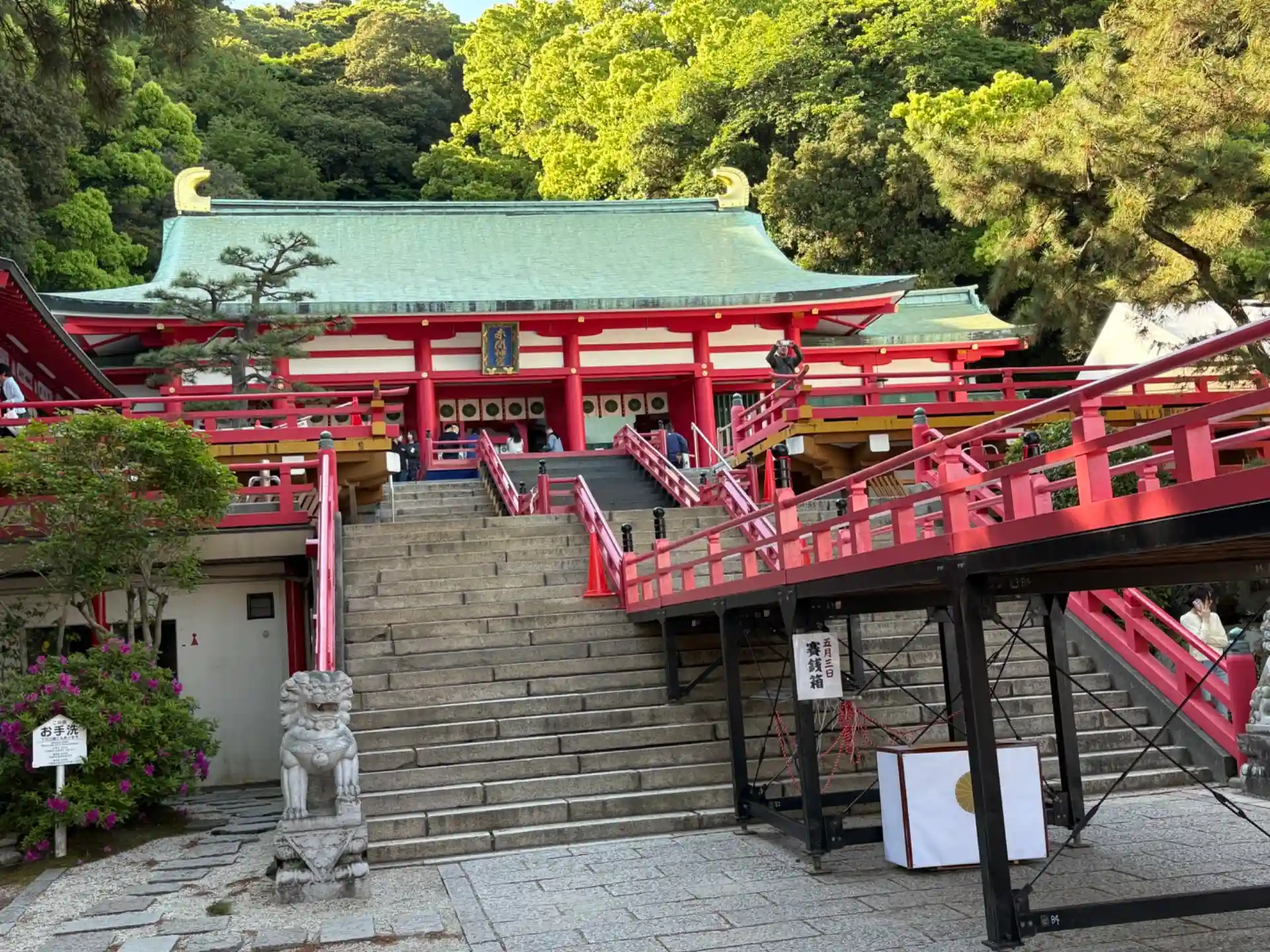 山口県下関市赤間神宮に参拝⛩️国道9号線沿いにあり真っ赤な水天門が目立つ〜まるで竜宮城〜神社で壇の浦の戦いで入水された幼帝・安徳天皇(81代天皇)を祀っている。明日は先帝祭の上臈道中があり準備で大忙しの様子、駐車場も全部閉鎖になっていた。耳なし芳一の「芳一堂」や平家一門の墓もある。御朱印は書置きでいただきました