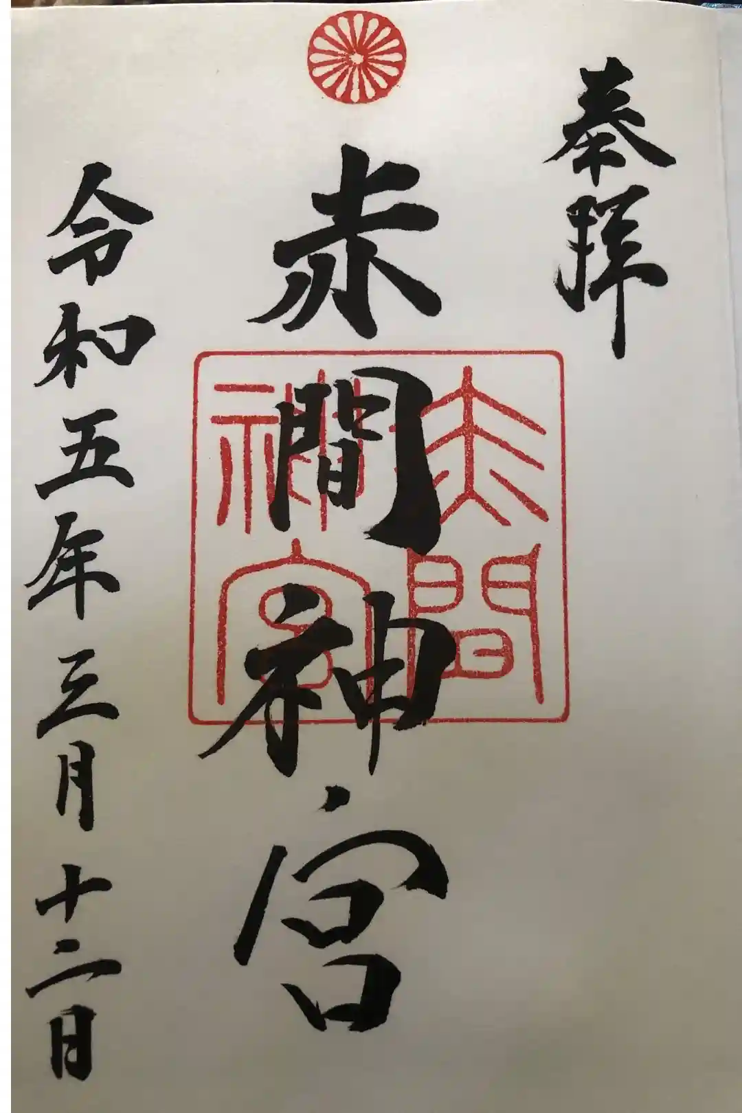 真ん中に赤間神宮と書かれ、上部に神紋である菊花紋の印、真ん中に赤間神宮の印が押されています。