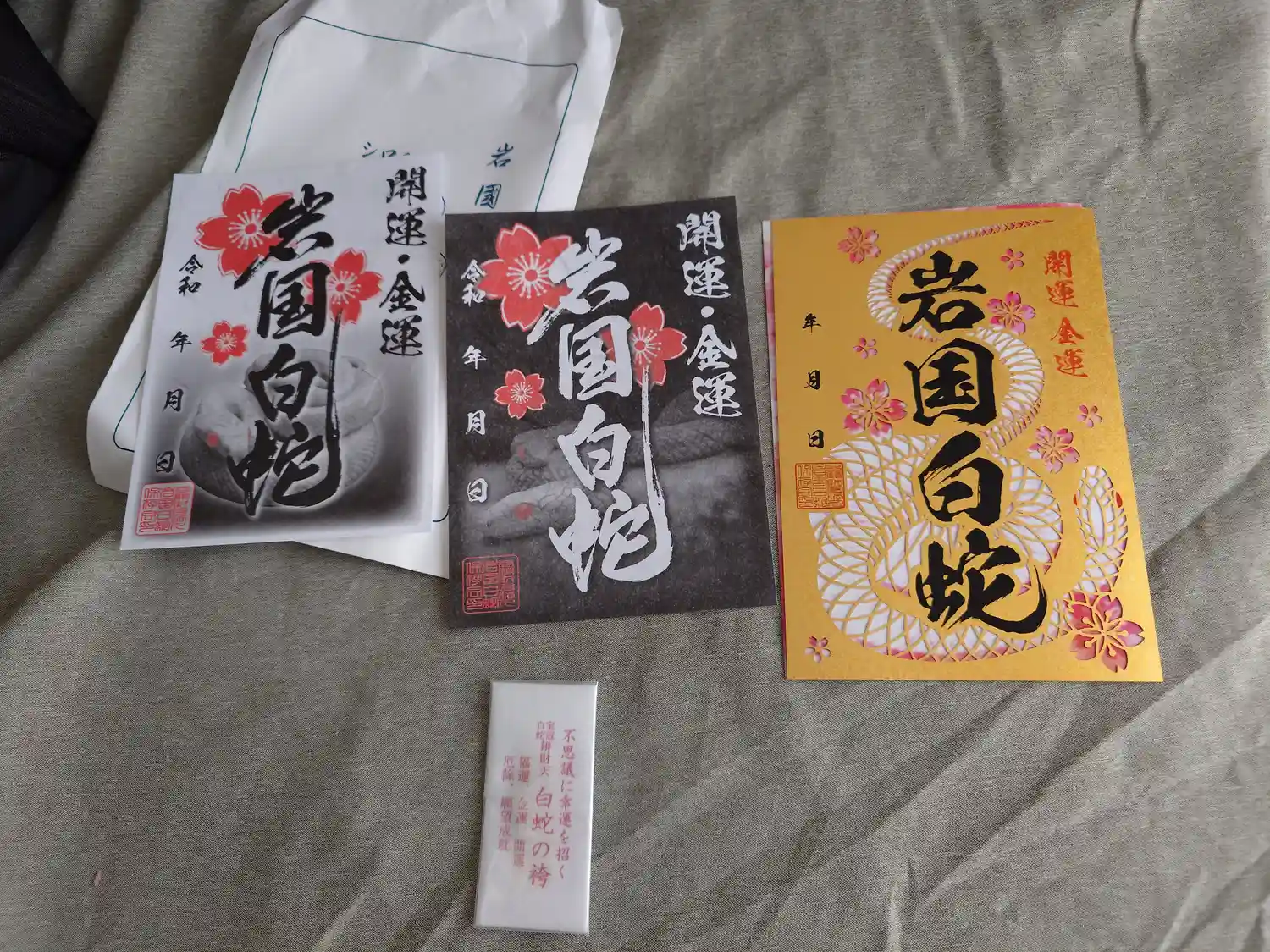 見えにくいですが白蛇が押印されています。神社には無数の白蛇が飼育されていて、白蛇が脱皮した皮が入っ…