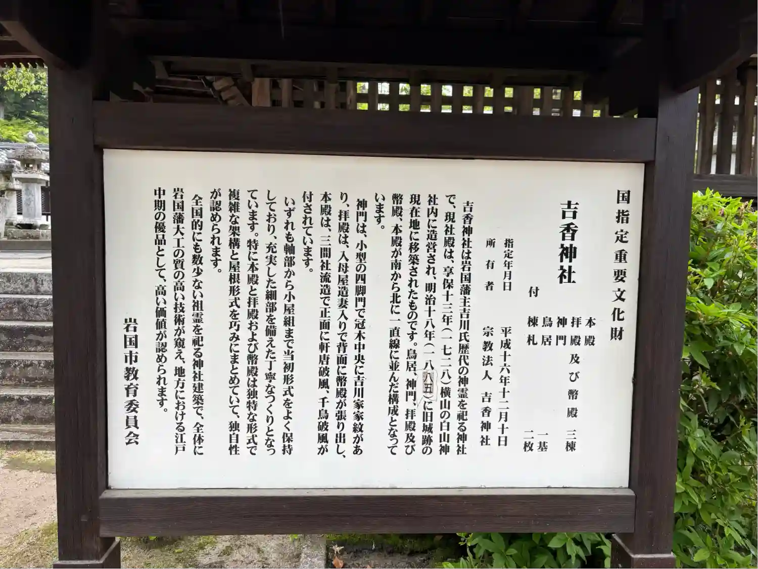 旧岩国藩主吉川家の先祖を祀る三社を統合して、1884年 (明治17年) 旧居館跡に建立。