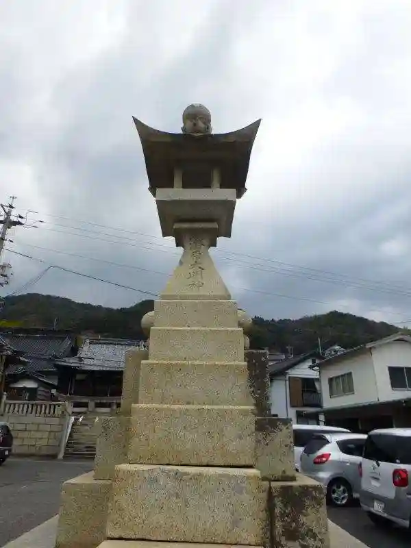 御祭神は、事代主神、豊玉彦神、底筒男命、中筒男命、表筒男命。俄祭りで繰り出される神輿は用明天皇をなぞらえたものと言われてます。大きな灯篭がとても印象的でした。