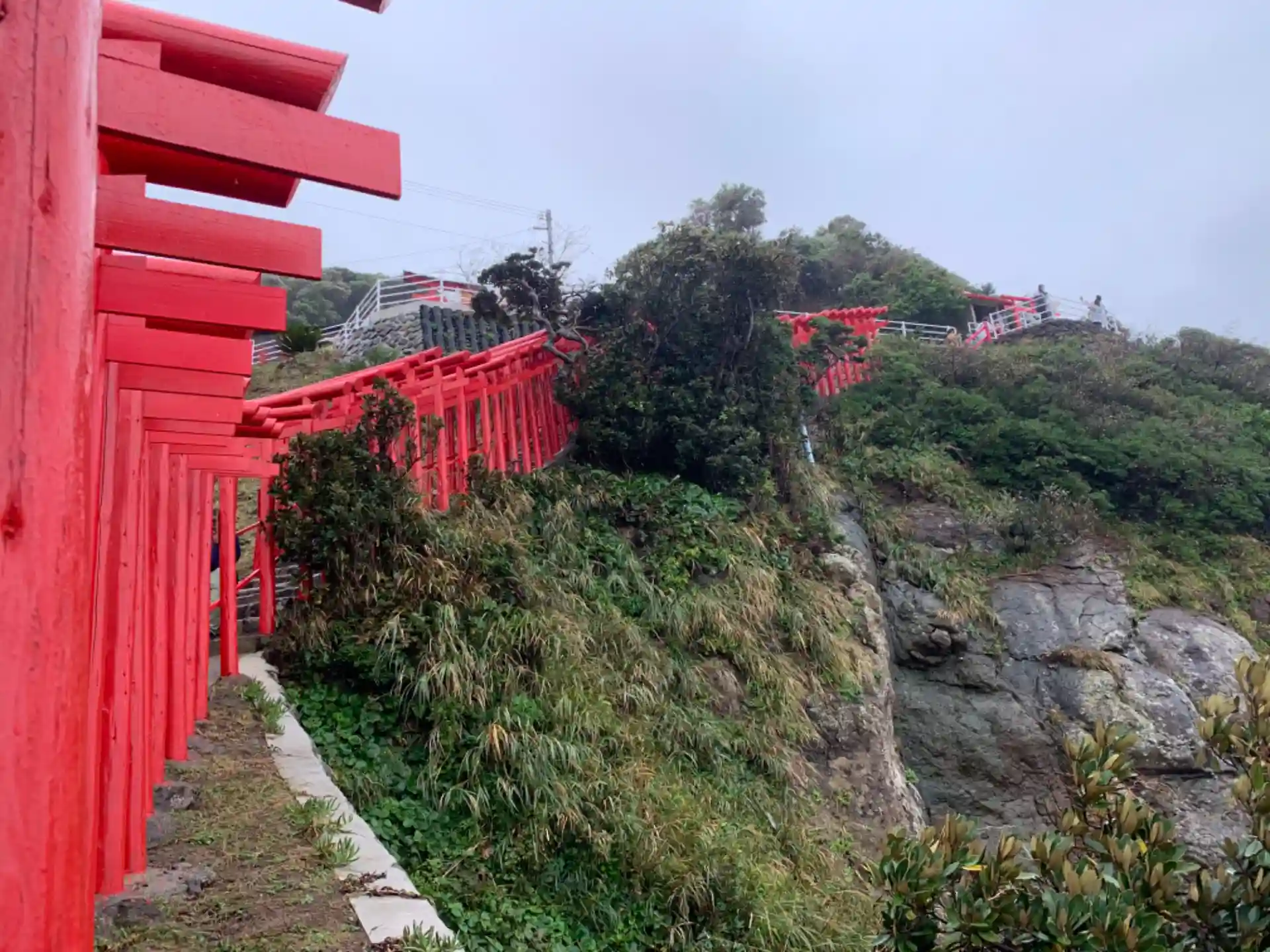 最大の見どころは、なんと言っても、海を望む斜面に連なる123基の鳥居、その全長はおよそ100メートル。青い海に向かって、朱塗りの鳥居がびっしりと立ち並ぶ。晴れていたら絶景だろうなぁと思いながら台風の後も滅多に見れる景色ではないと気持ちを切り替えて参拝しました。