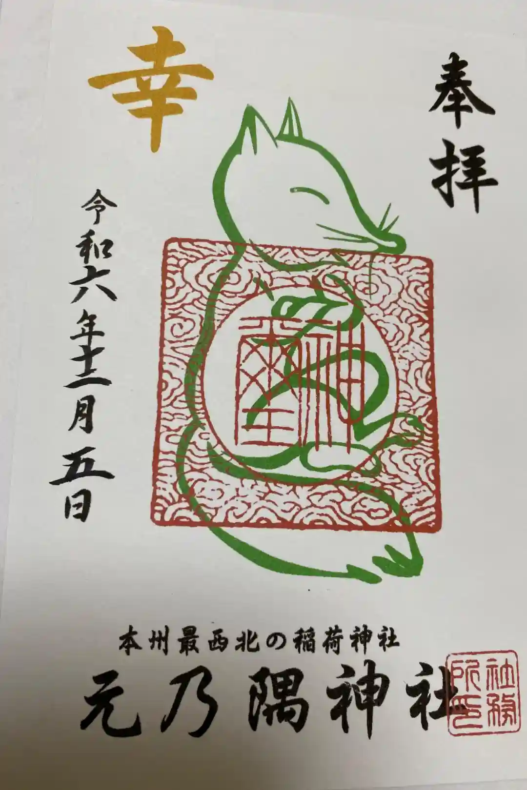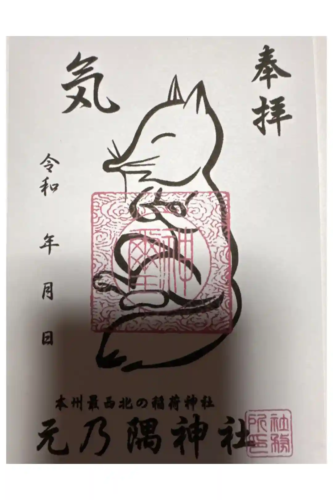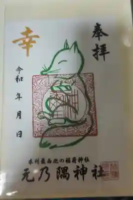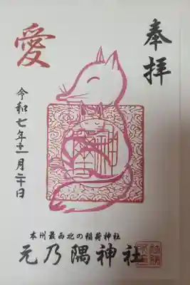 台紙の下部に「本州最西北の稲荷神社 元乃隅神社」と横書きで書かれて、神社印が押されています。