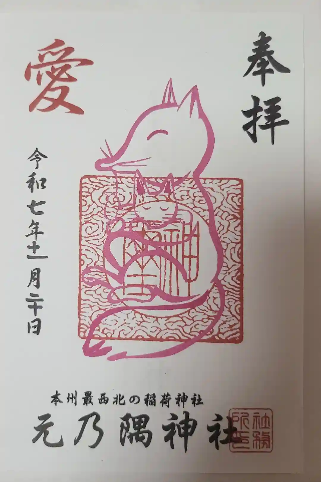 真ん中に「神璽」の印が押され、ピンク色のきつねの絵が描かれています。