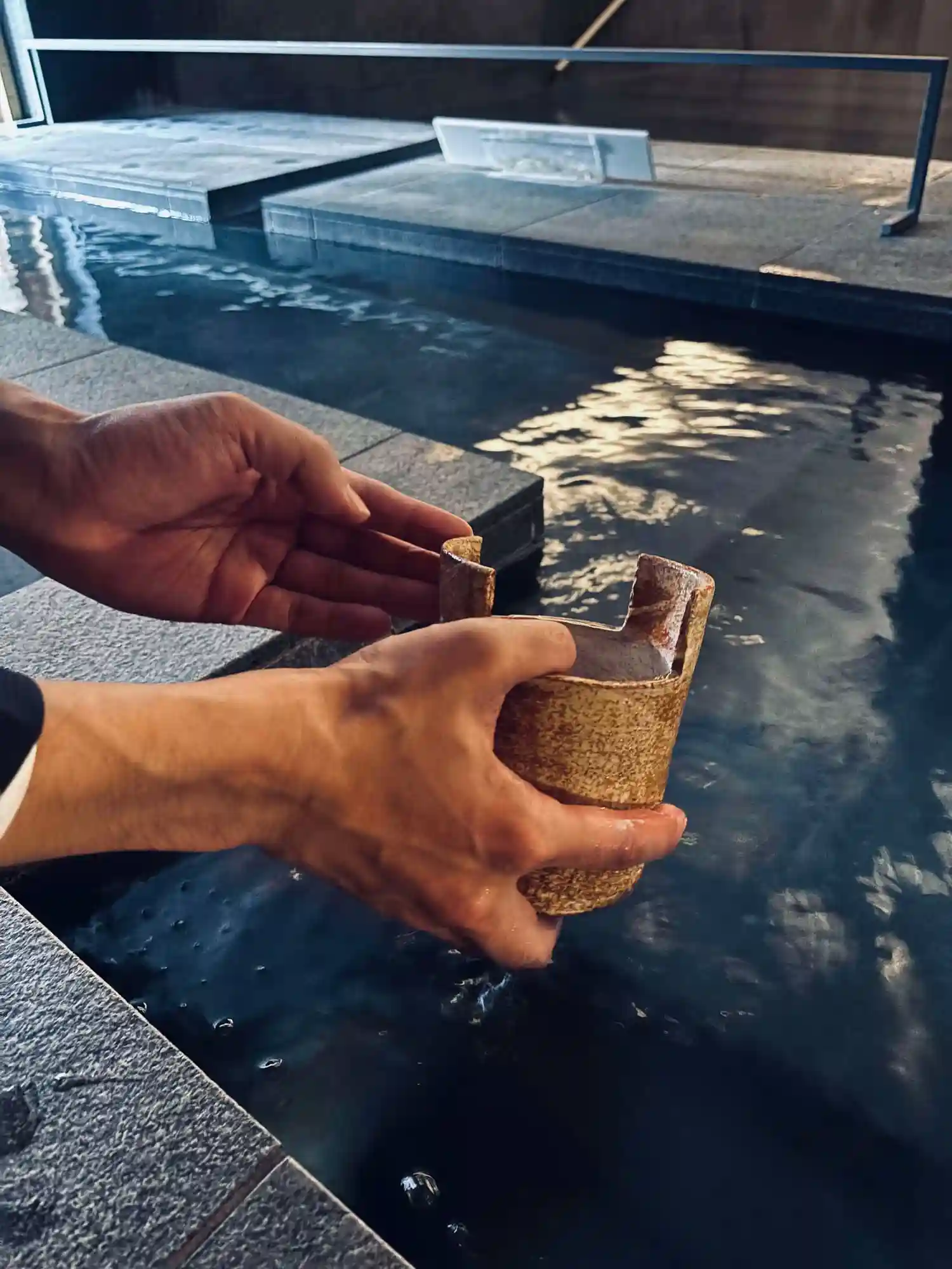 片手桶でお湯を汲む。