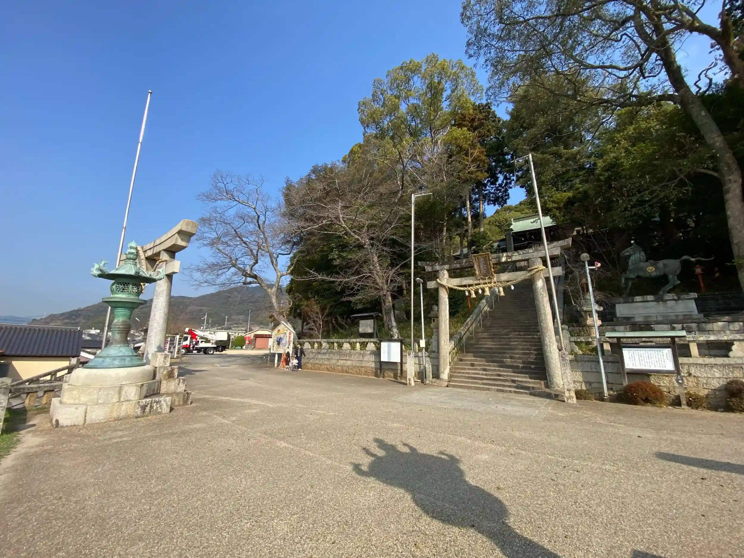 すごく立派な神社でした。境内から見下ろすまっすぐの道路が印象的。
